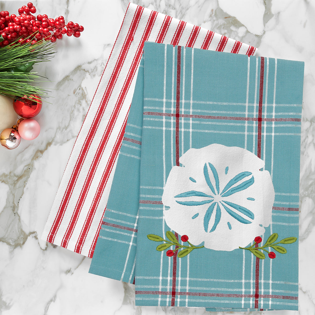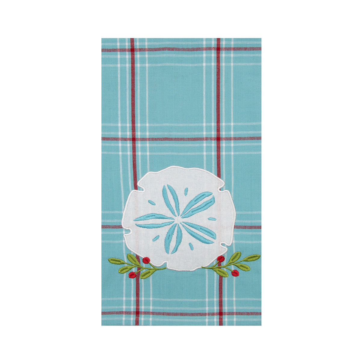 Experience the beachy warmth of a seaside Christmas with this Coastal Holiday Embroidered Woven Kitchen Towel. Delight in the delicate red and white plaid on top of a coastal blue background, adorned with a sand dollar seashell. Perfect for adding a splash of holiday cheer to any kitchen sink.