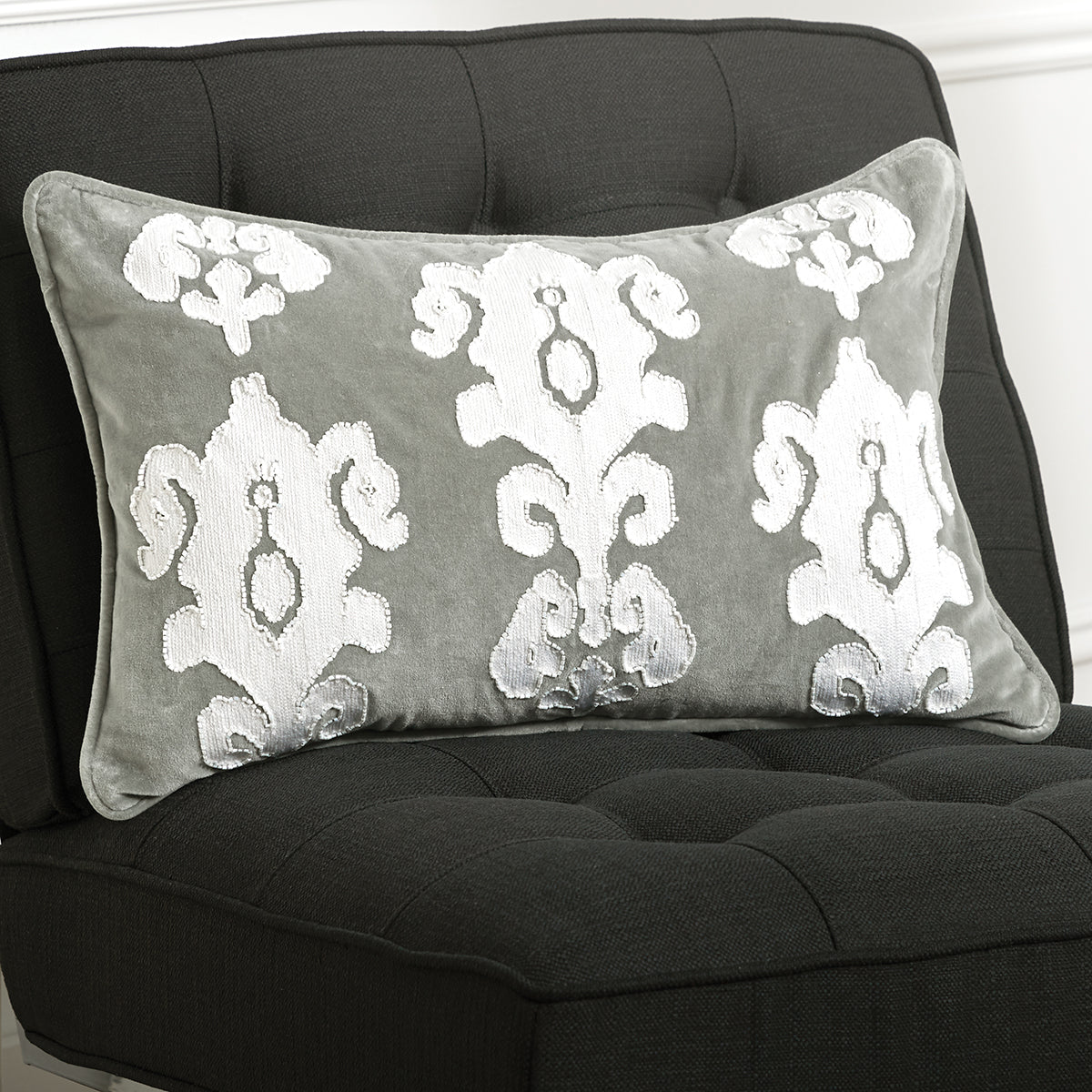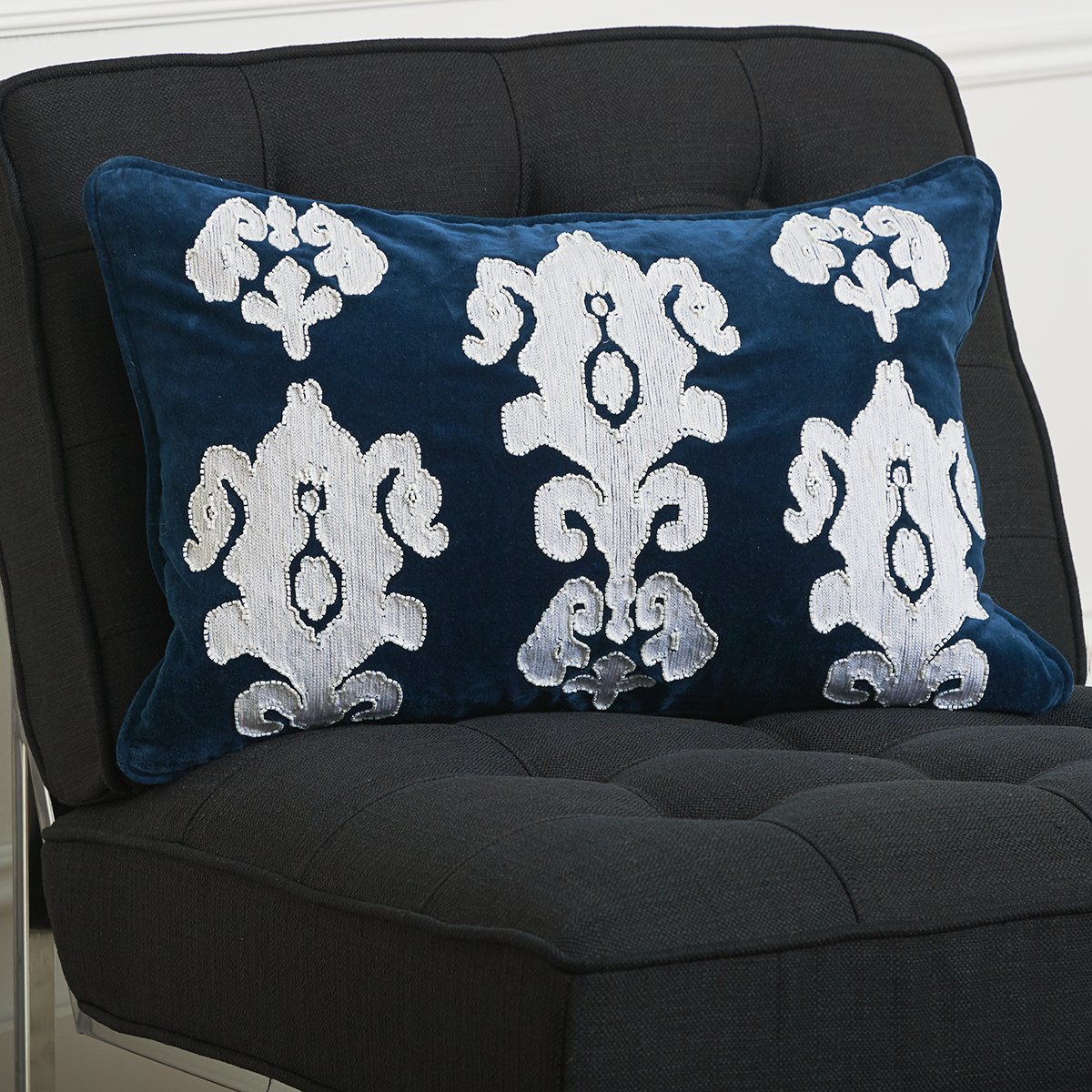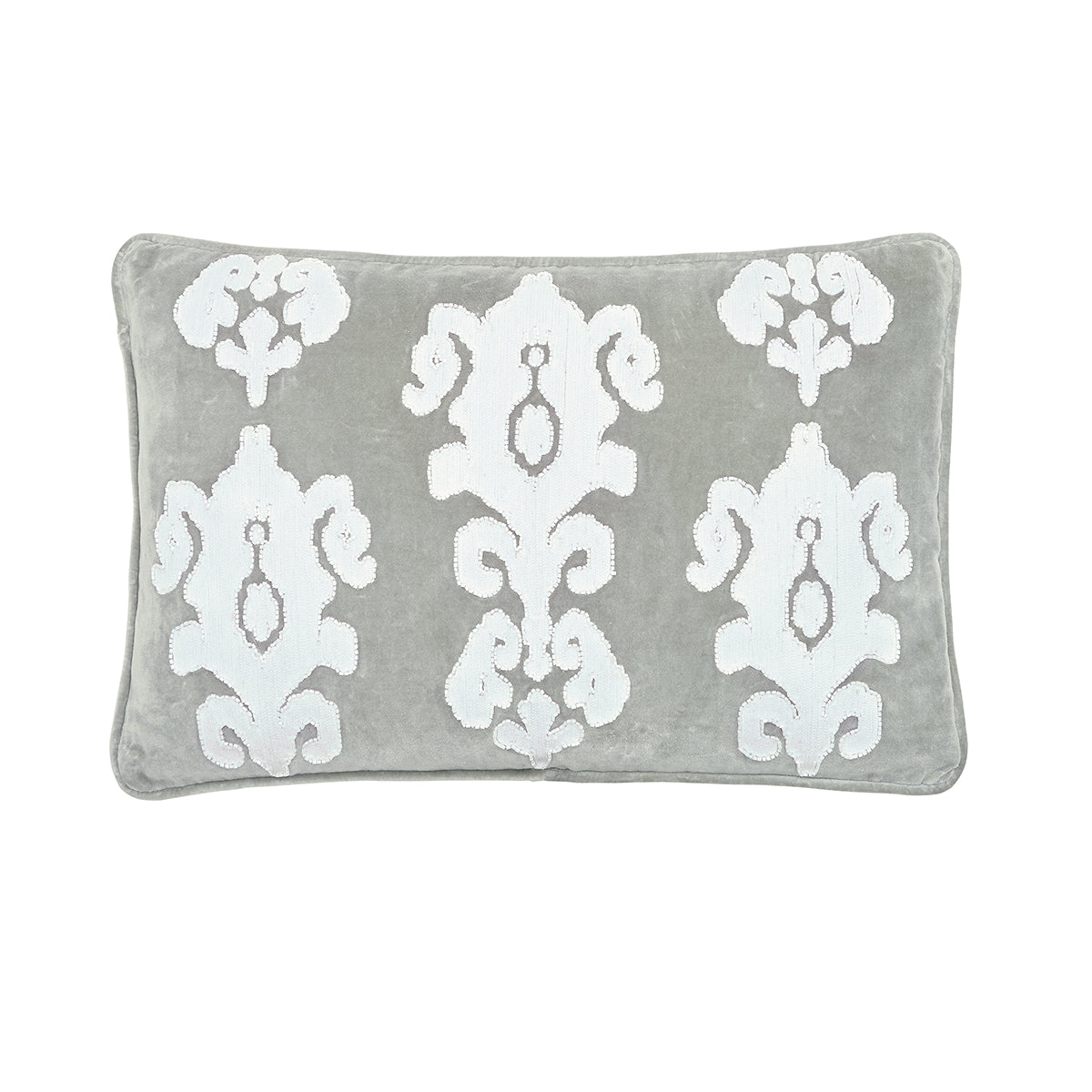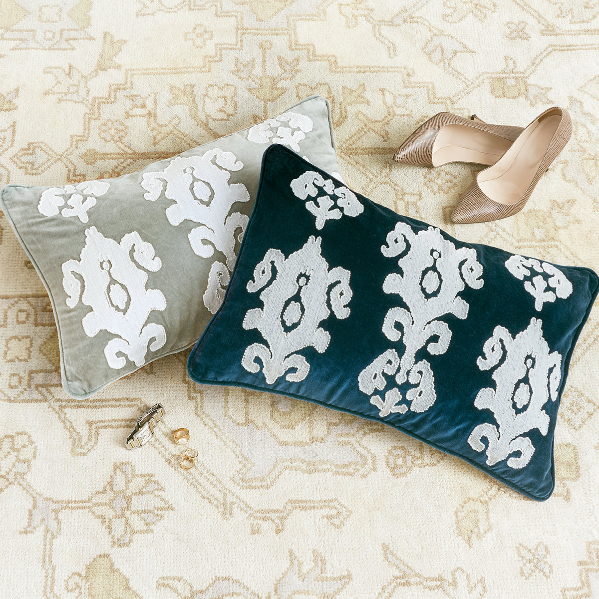 A refined ikat-inspired design tempts and entices. Glamorous cotton velvet envelops an ample feather down insert. And hand-beaded detail shines out like a light glimmering through the fog. Alida does not withhold the power of its beauty, but casts it on all that is near to bring elusive yet extraordinary details to light.