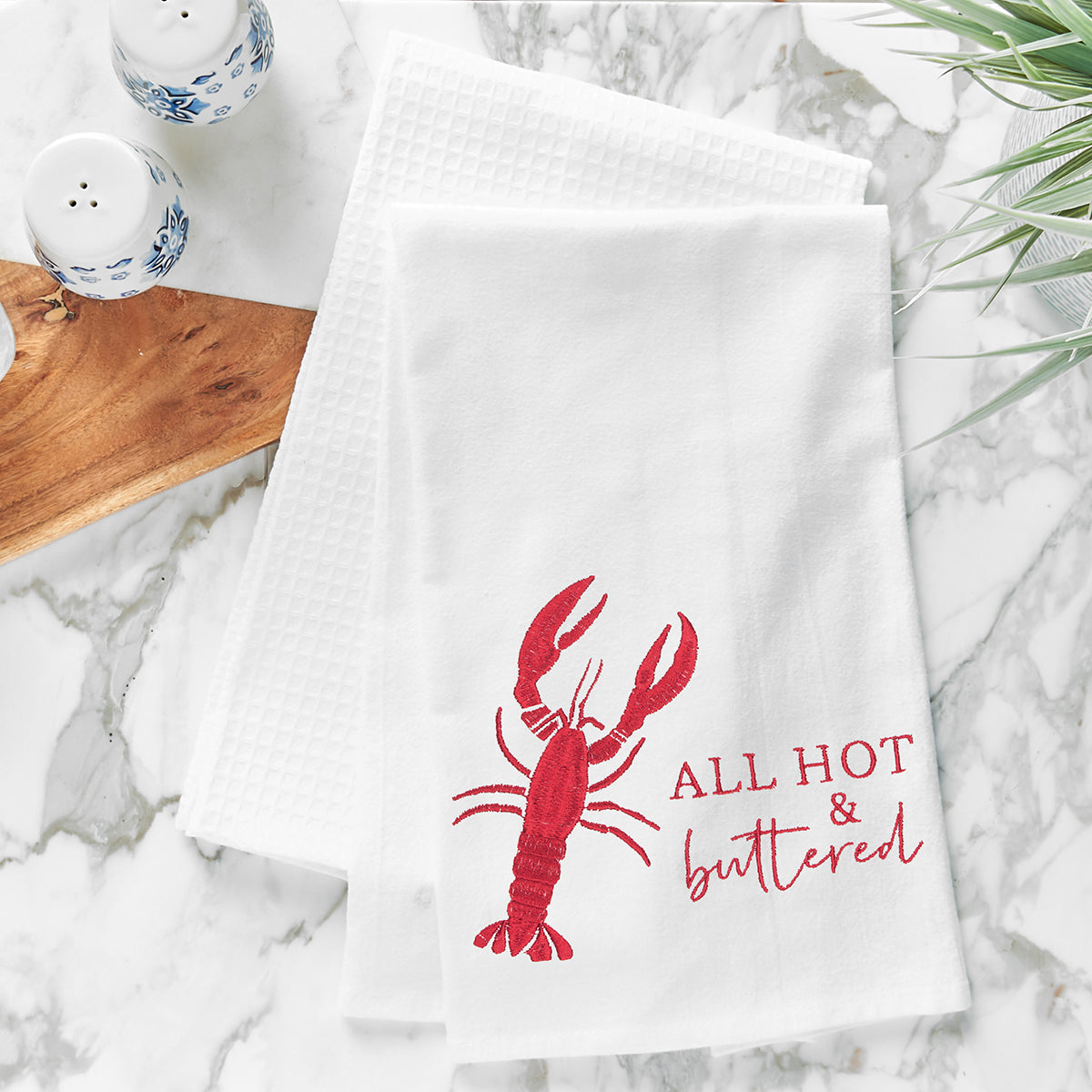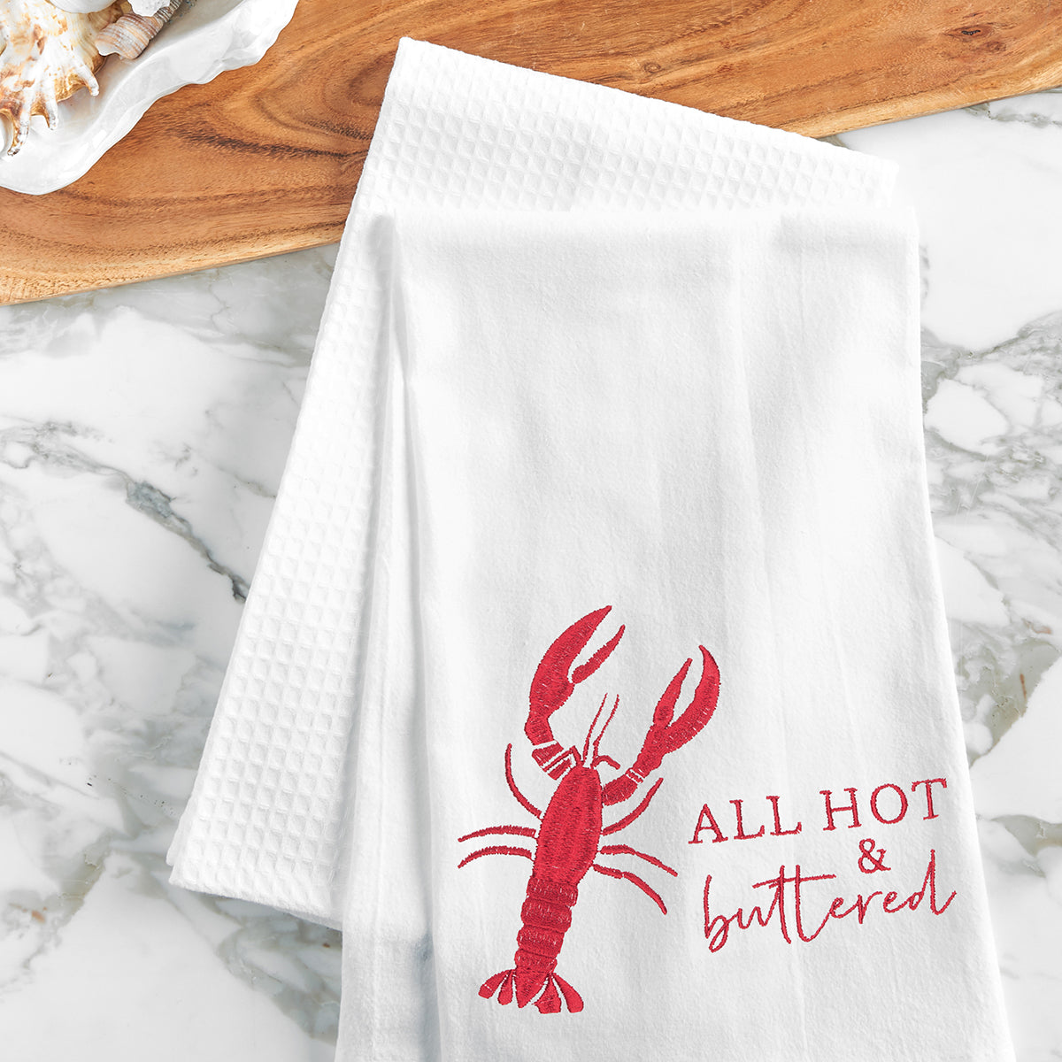 A flour sack towel showcasing the delightful phrase All Hot & Buttered, alongside a timeless lobster illustration, both presented in traditional nautical red on a crisp white background.
