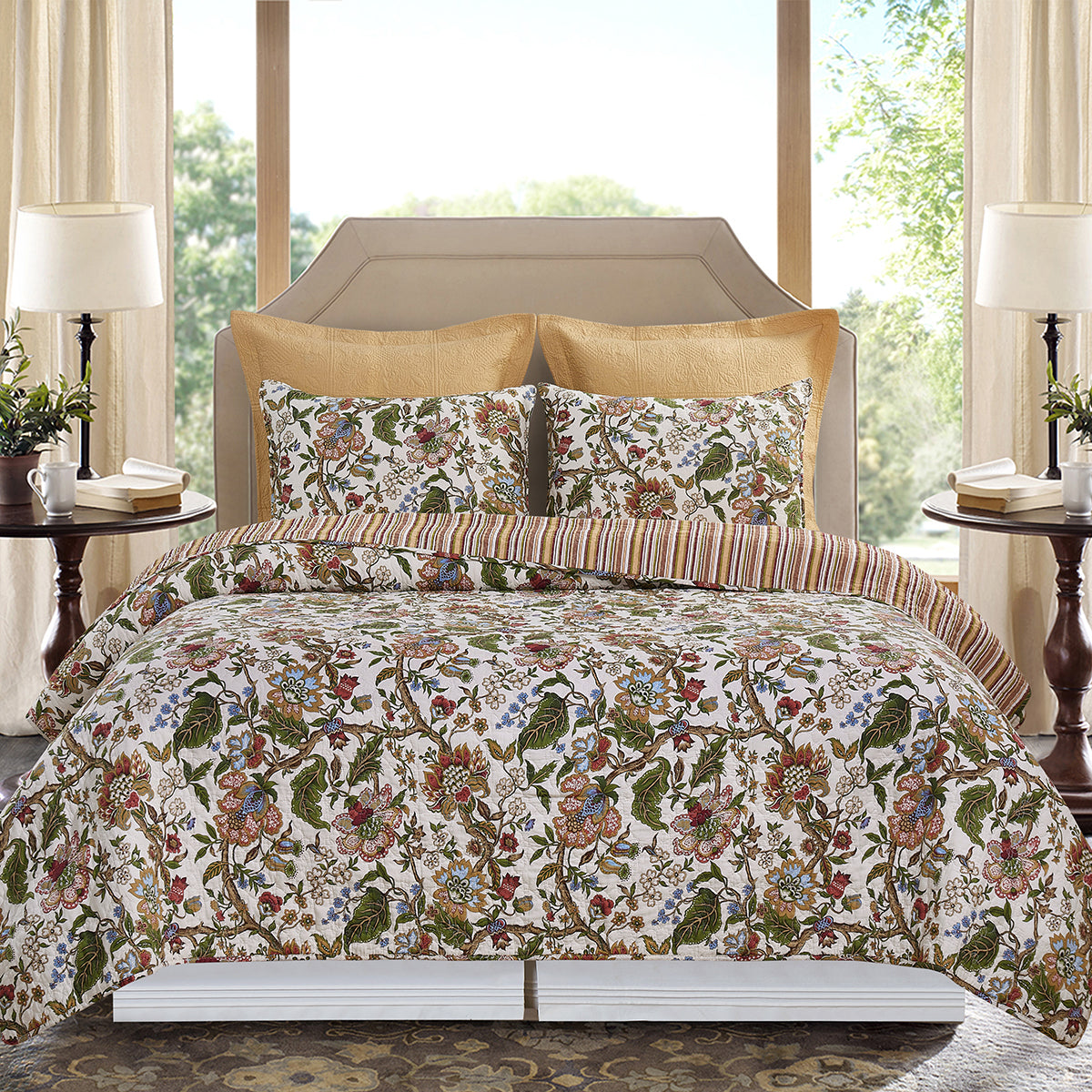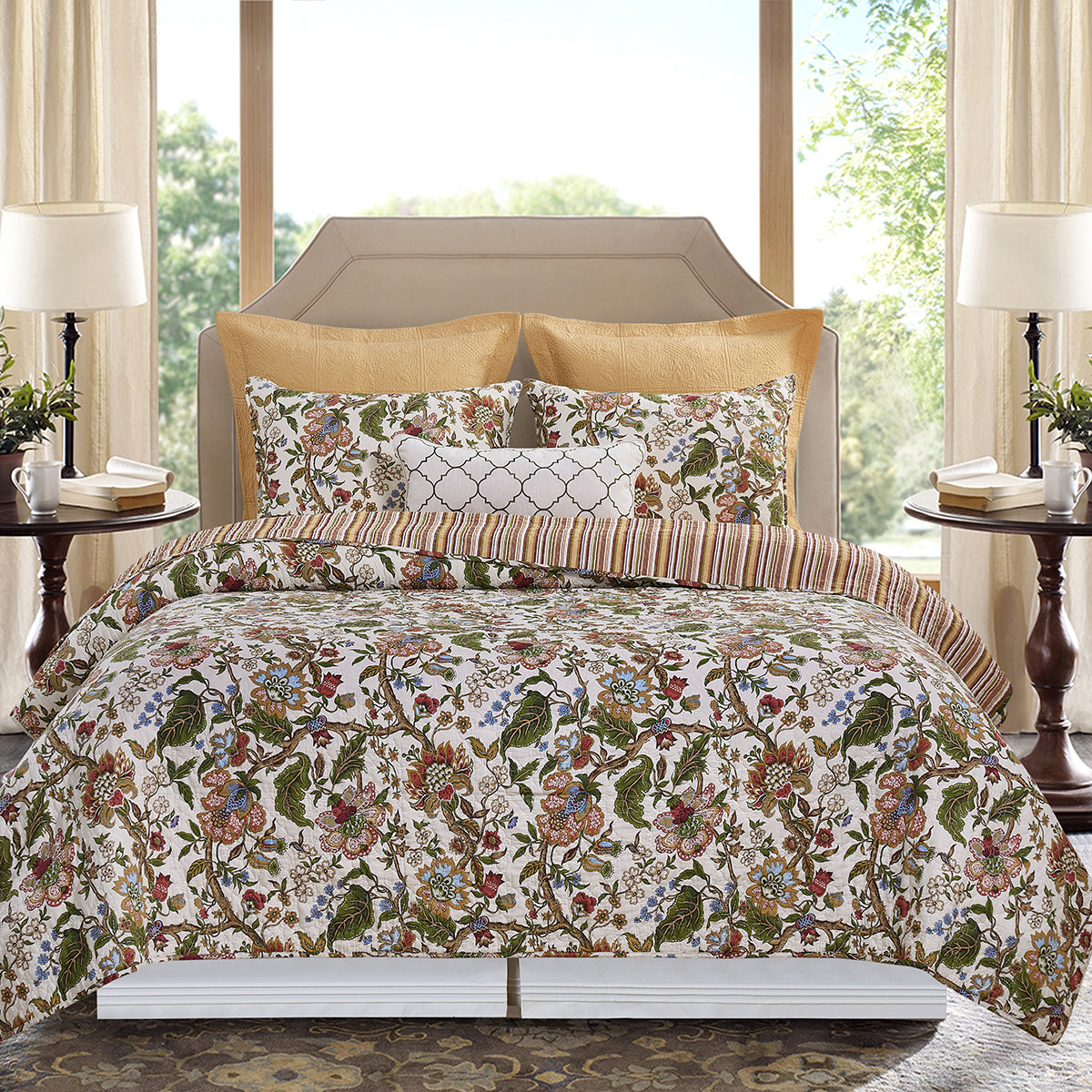 The Amara Quilt Set features a traditional floral and Jacobean pattern in bold botanical colors. Rosebud stitching brings texture to the quilt, while green, red, brown, yellow, and blue tones combine for a rich aesthetic. Reverse to a coordinating stripe pattern. Create a warm, inviting atmosphere in your bedroom. Love this pattern? Amara is also available in a tabletop collection.