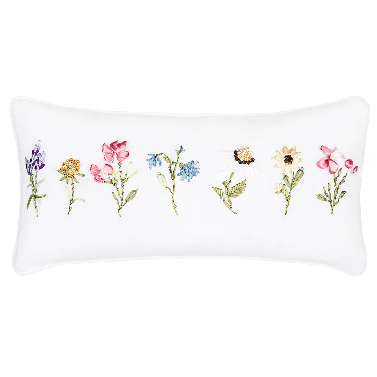This 20-inch-long ribbon art embellished pillow showcases a delightful variety of spring blooms adorning slender stems with lush foliage. Featuring an array of flowers such as lavender, daisies, and other spring blossoms, it lends an elegant floral accent to any setting, while its neutral background ensures versatility in styling.