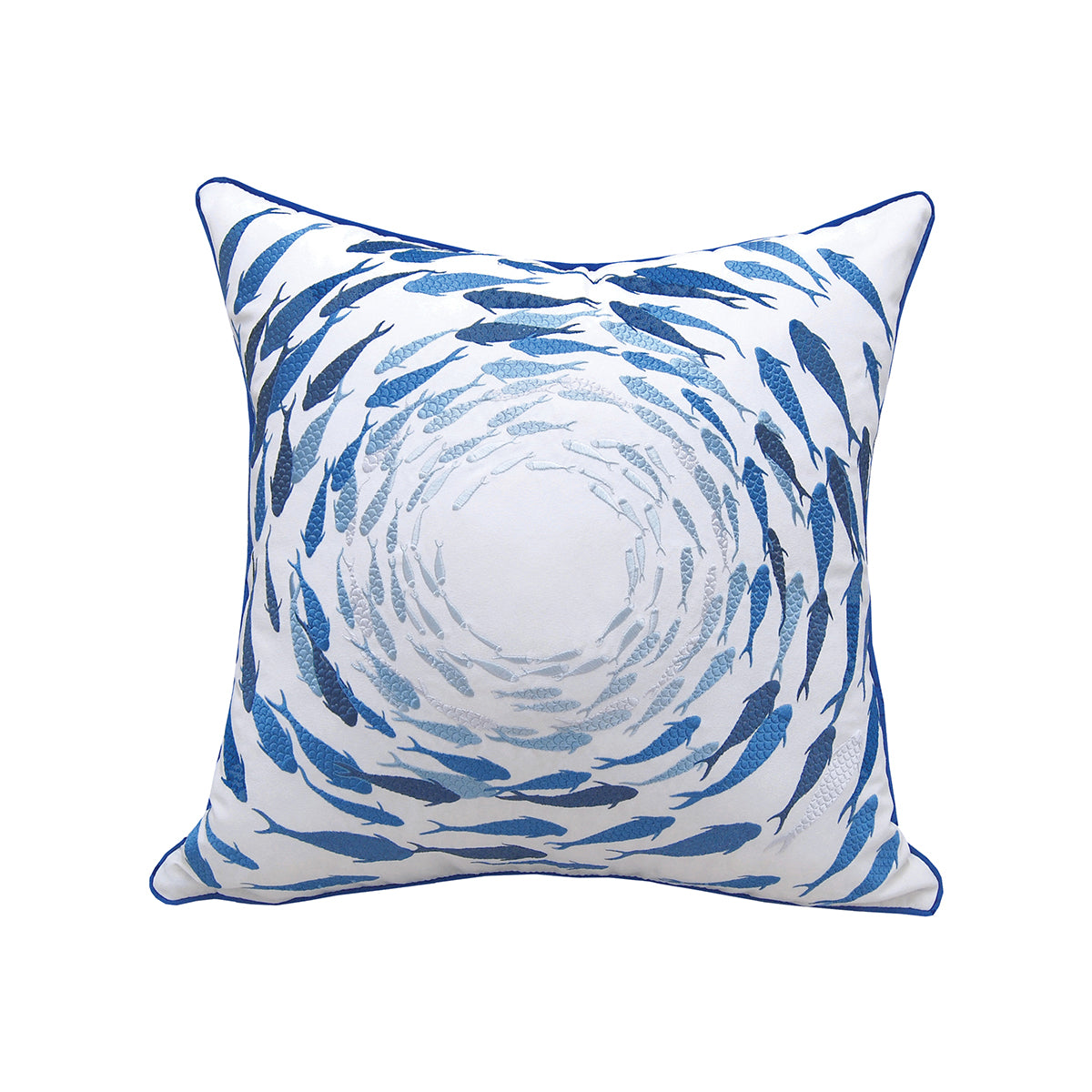 Heavily embroidered multi-blue embroidered fish school pillow made for indoor/outdoor coastal lifestyles, our Olefin performance fabric pillow brings the sea to your living space. Sun fade-resistant outdoor tough.