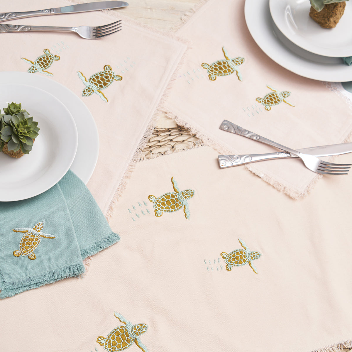 The migration of turtle hatchlings to the sea is nothing short of magical. Our sea green cotton napkins feature a fringed edge and are embroidered with a baby sea turtle.
