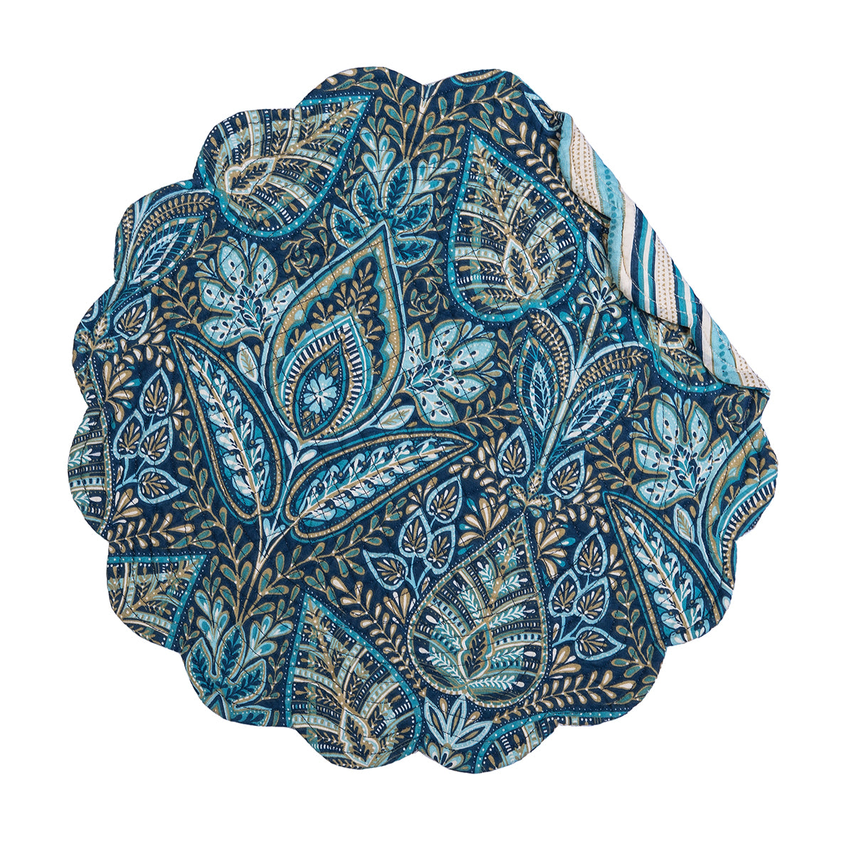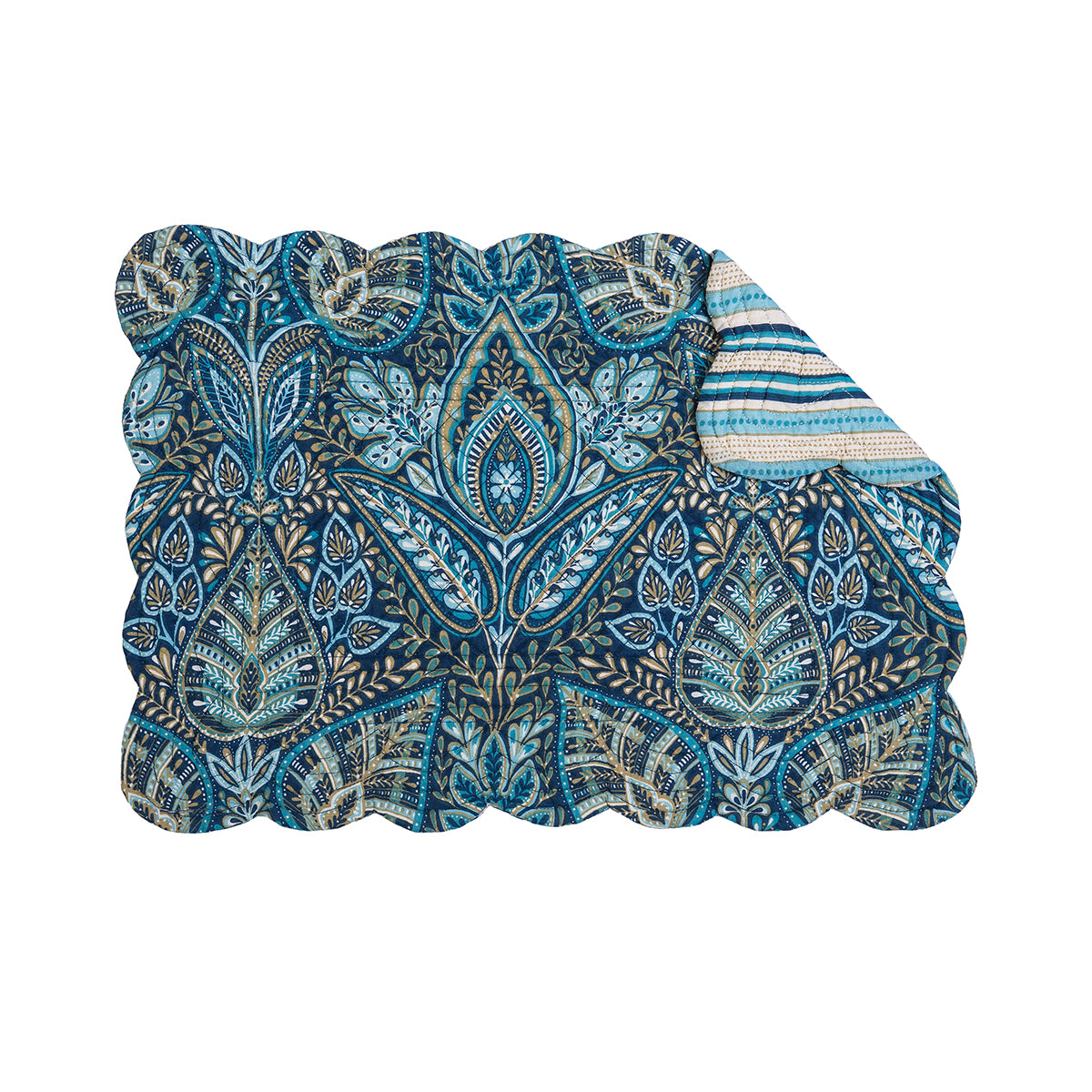 The Bailey Blue quilted table linen collection shows a rich navy blue and green damask medallion pattern, elegantly accented with floral botanical elements. Subtle pops of teal, tan, and white add a refreshing touch, making this design perfect for everyday dining. For added versatility, the reverse side features a simple stripe pattern in coordinating colors. Stylish and sophisticated, this collection brings a timeless yet fresh look to any table setting. Love this look? Bailey Blue is also available as a bedding collection.