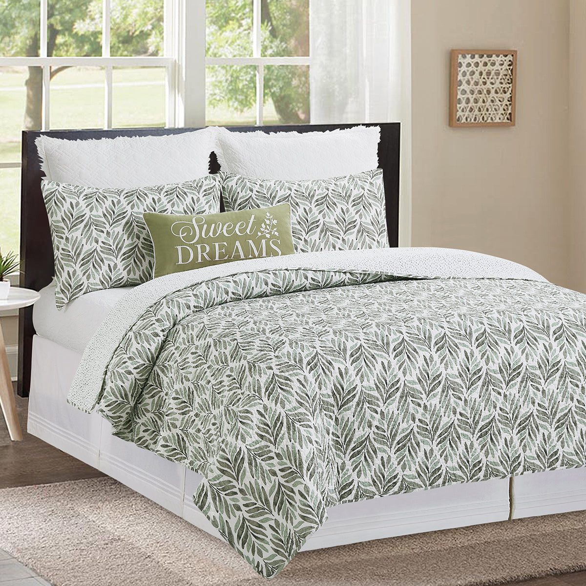 Add a touch of nature to your bedroom with the Blair quilt set. Its bold watercolor leaves and modern botanical motif in eucalyptus, green, and brown hues create a unique, stylish look. Enhance your room with this timeless quilt set.