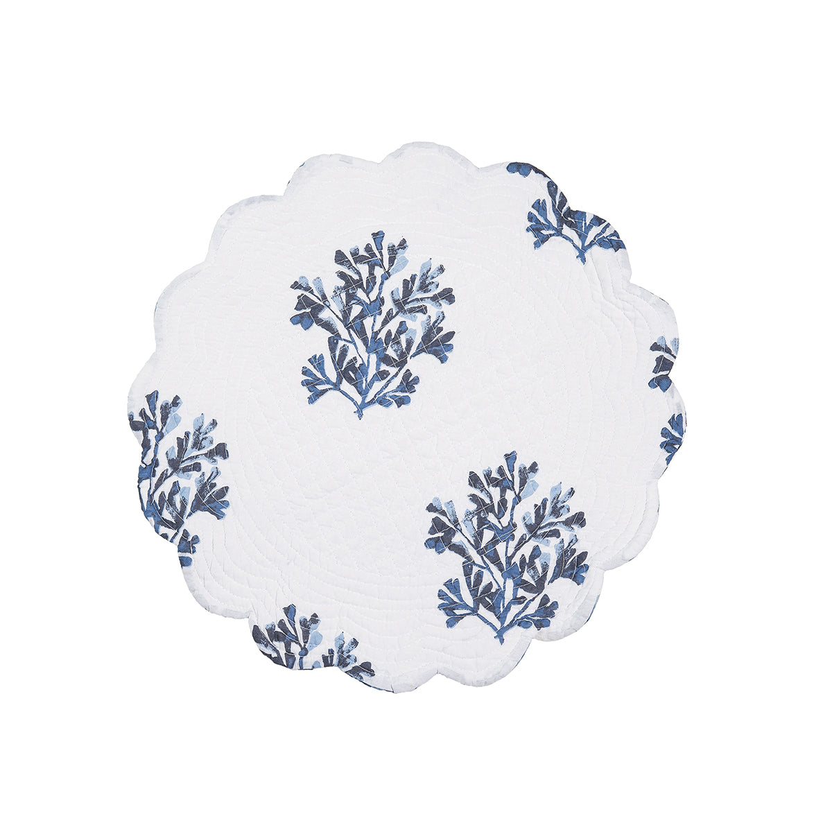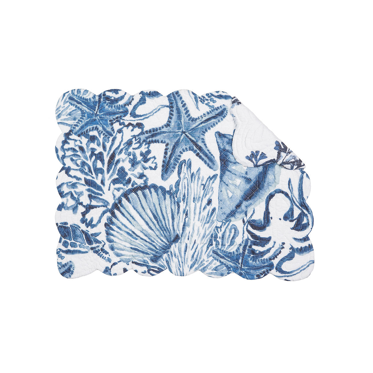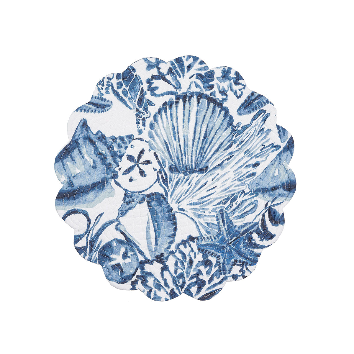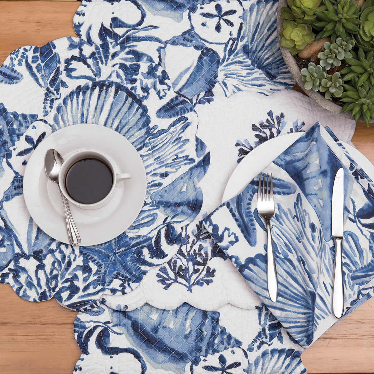 Transform any tabletop into a coastal paradise with Blue Coast Shells, featuring an indigo shell, sand dollar, and coral design that gives the room a dreamy beach vacation feel. Reverses to a coordinating coral print.