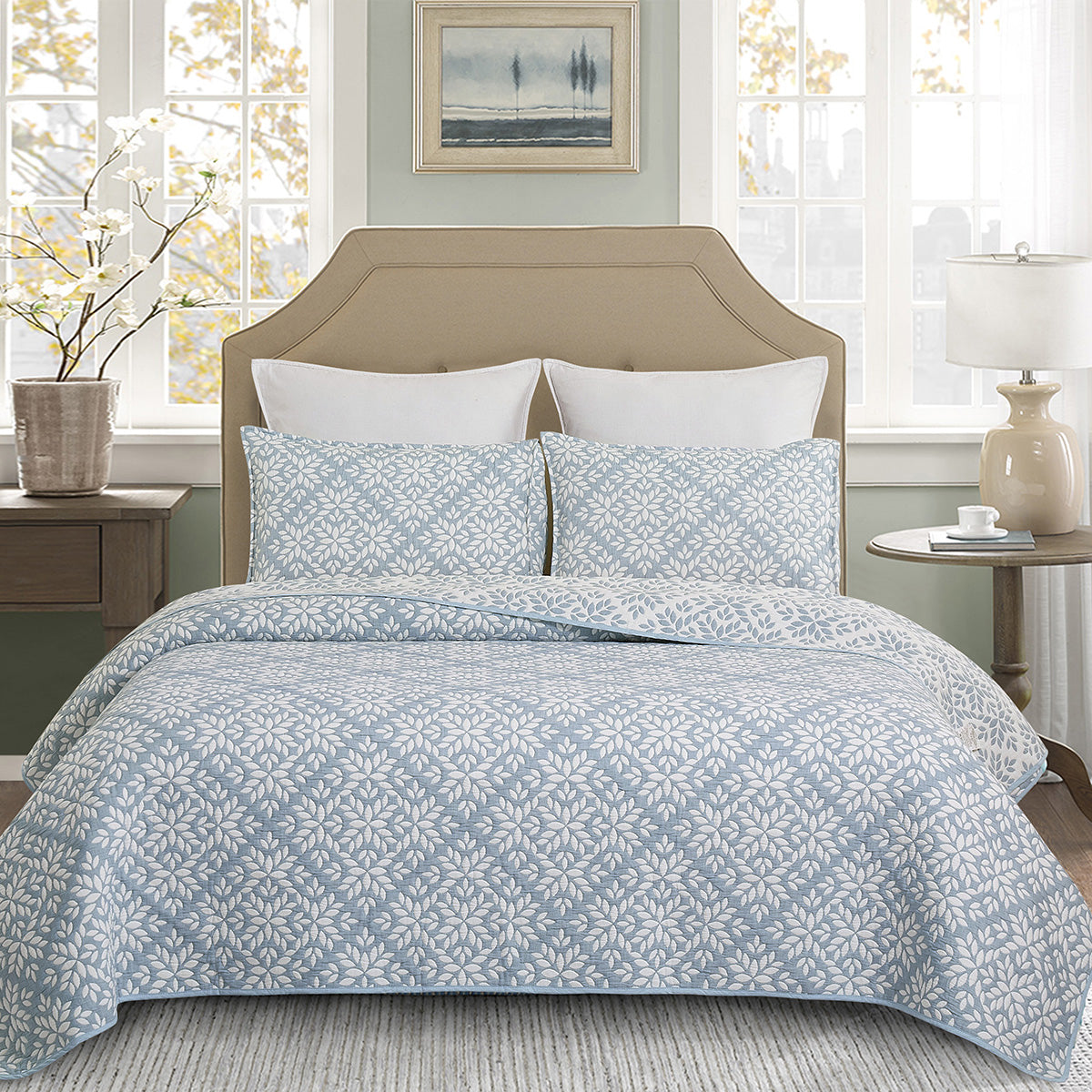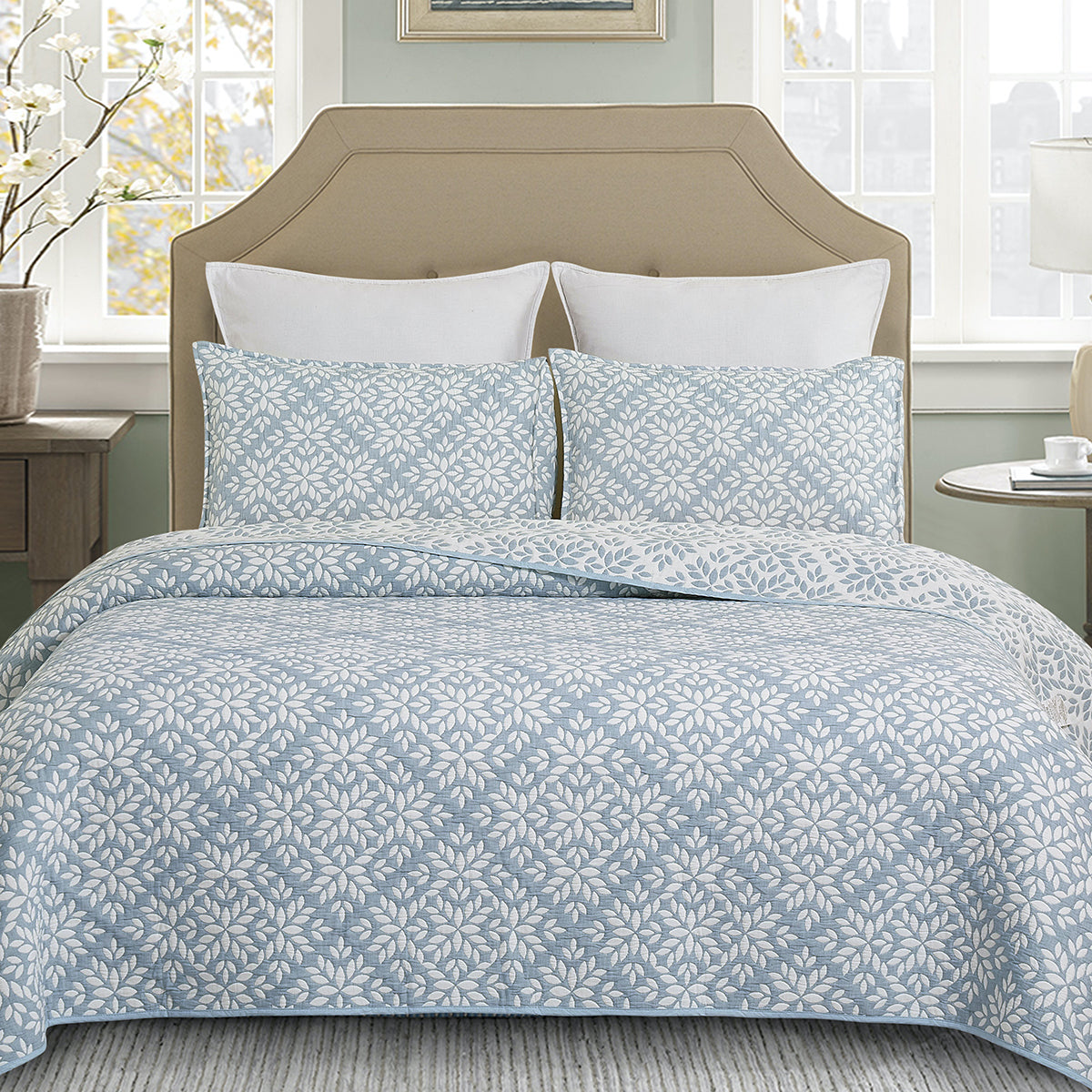 Introducing the Light Blue Leaves Jacquard Coverlet Set. With a beautiful leaf design in a diamond pattern on a modern blue background, this coverlet set adds a touch of elegance to your everyday bedding. Plus, it is reversible for even more styling options.