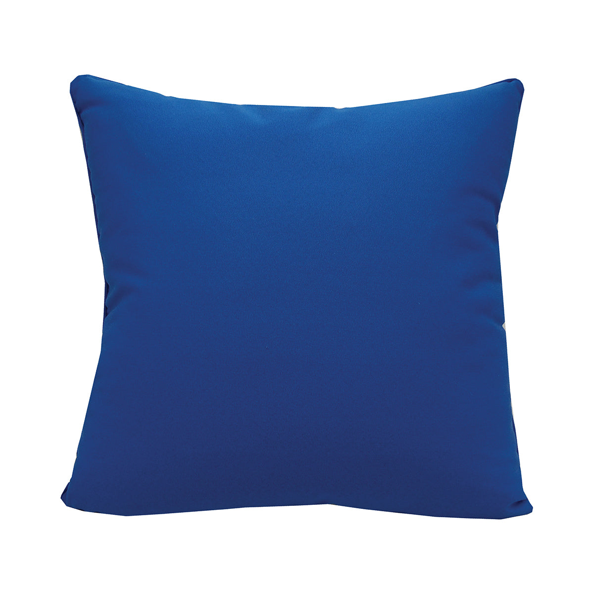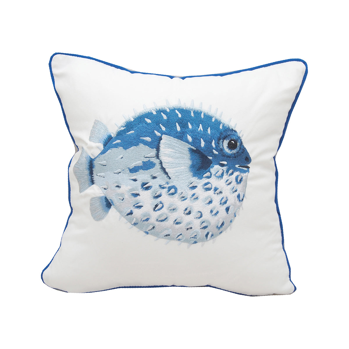 The adorable pufferfish, embroidered in decorator blue threads on crisp white panels, with true blue piping and rear panel. Sun-fade resistant and made outdoor tough.