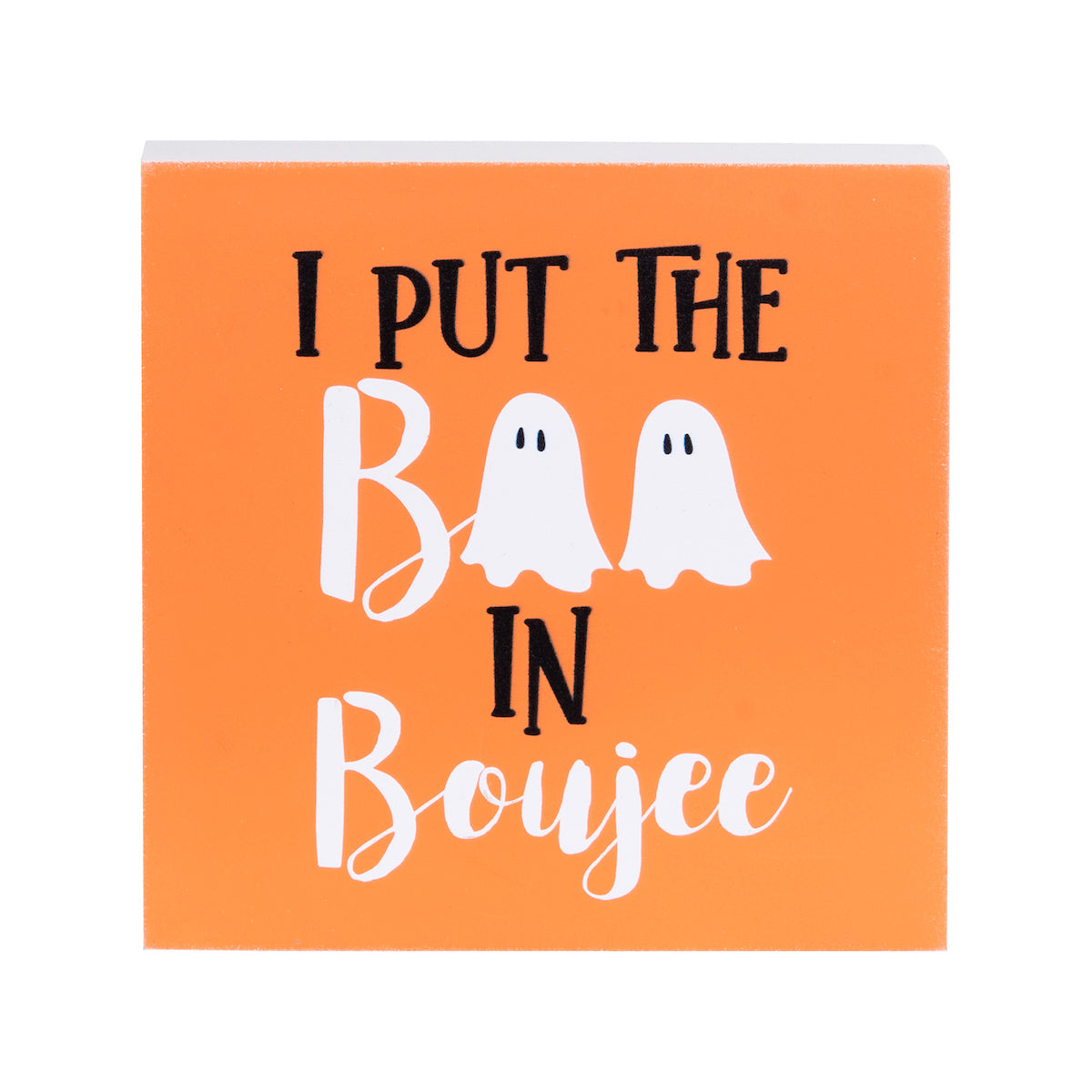 This Halloween shelf block features I put the Boo In Boujee written in black and white with two ghosts on a bright organce background.