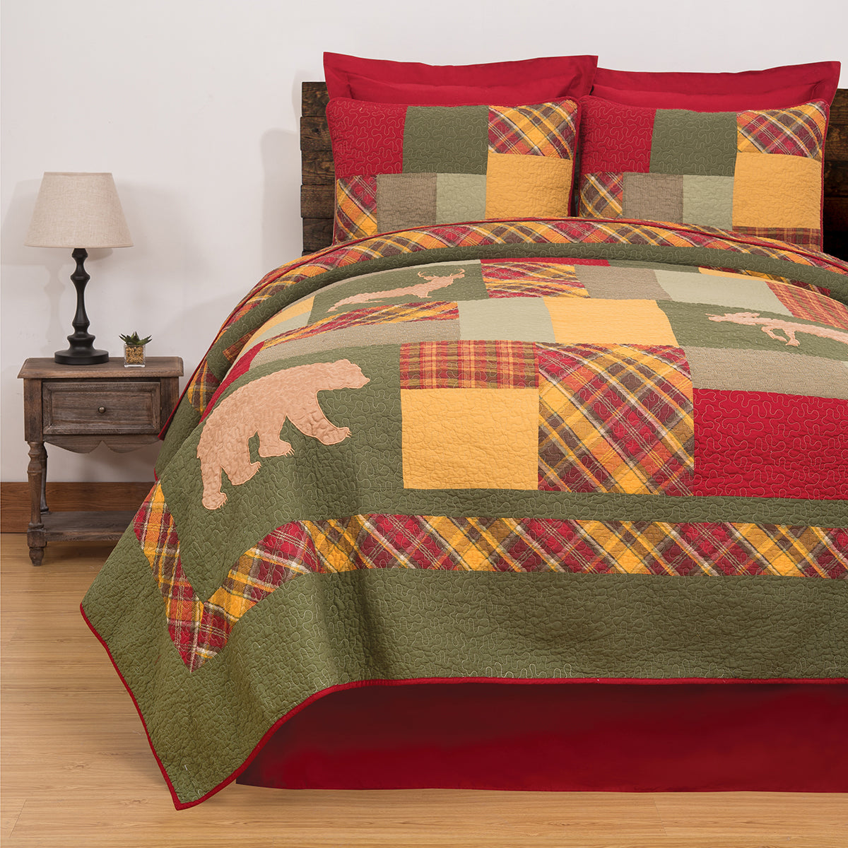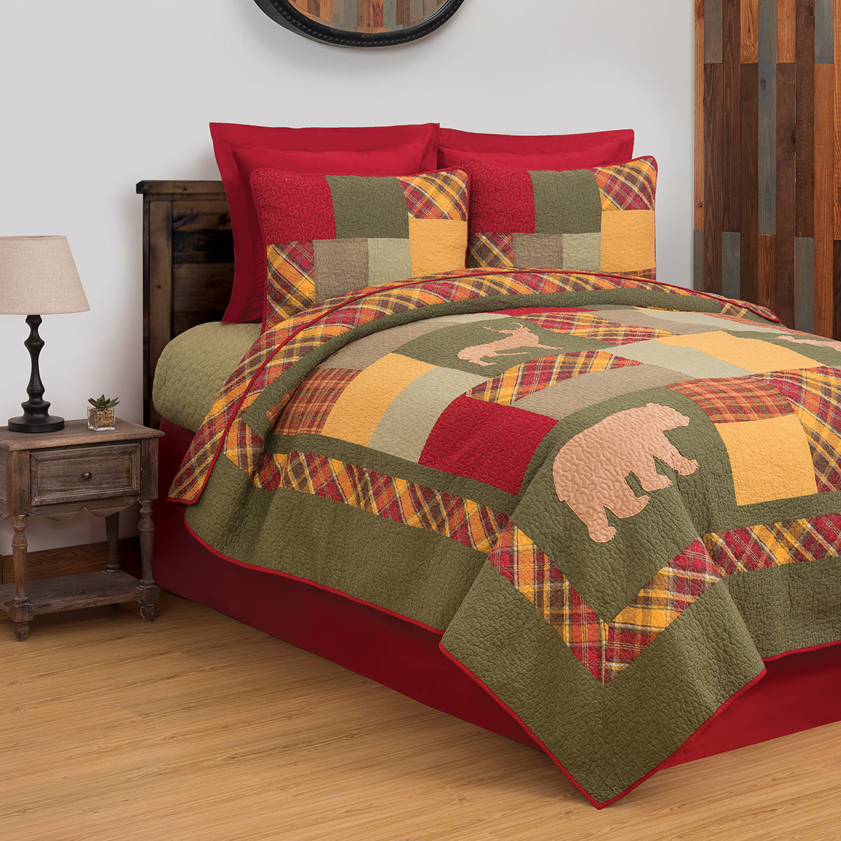 Get cozy in a cabin in the woods or relax at home with the hand pieced, rustic Buckley quilt set. A color blocked design comprised of woodland appliques, rustic plaids, and a red, green, yellow, and brown color way creates a lodge feel in any setting. Reverse to a coordinating plaid pattern for additional styling options. Finished with vermicelli stitching and a fabric edge, the Buckley quilt is crafted of 100-percent cotton and is machine washable for easy care. Coordinating accent pillows, euro shams and bed skirt available separately.