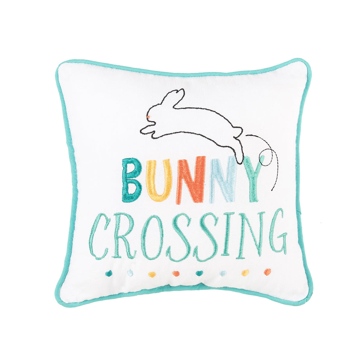 With a sweet Easter design embroidered in a colorful palette of teals, orange, and yellow, the Bunny Crossing Pillow was made for sunny days and garden egg hunts. Finished with a teal piped border, cotton cover, and polyester fill, this pillow will bring joy to all your favorite spring traditions.