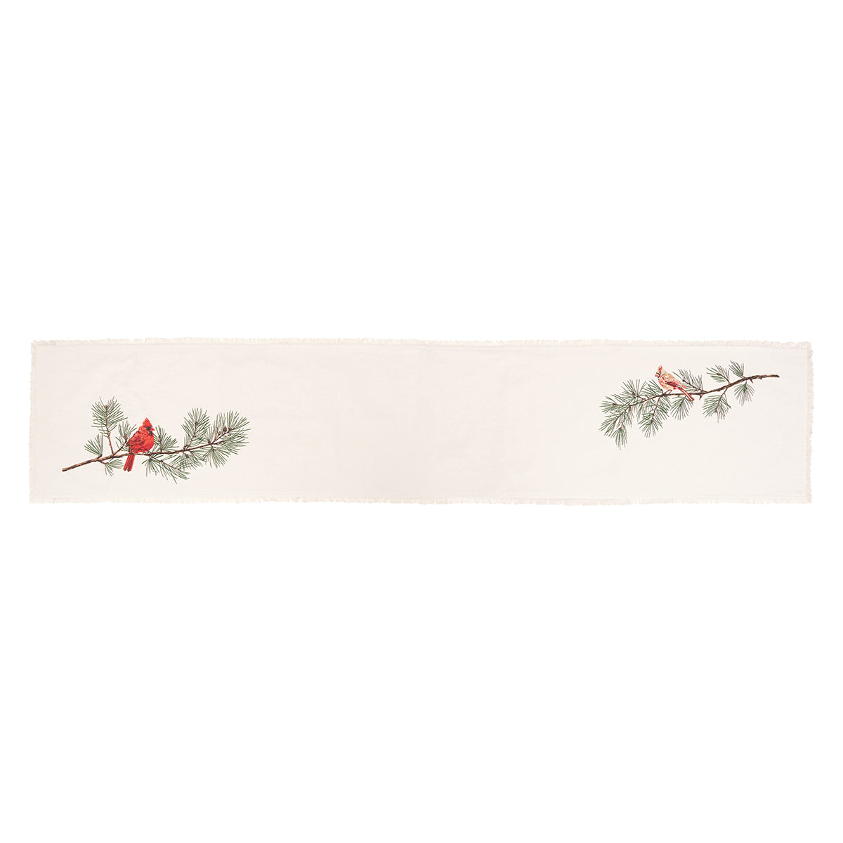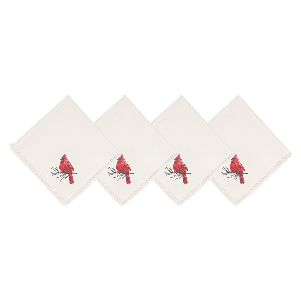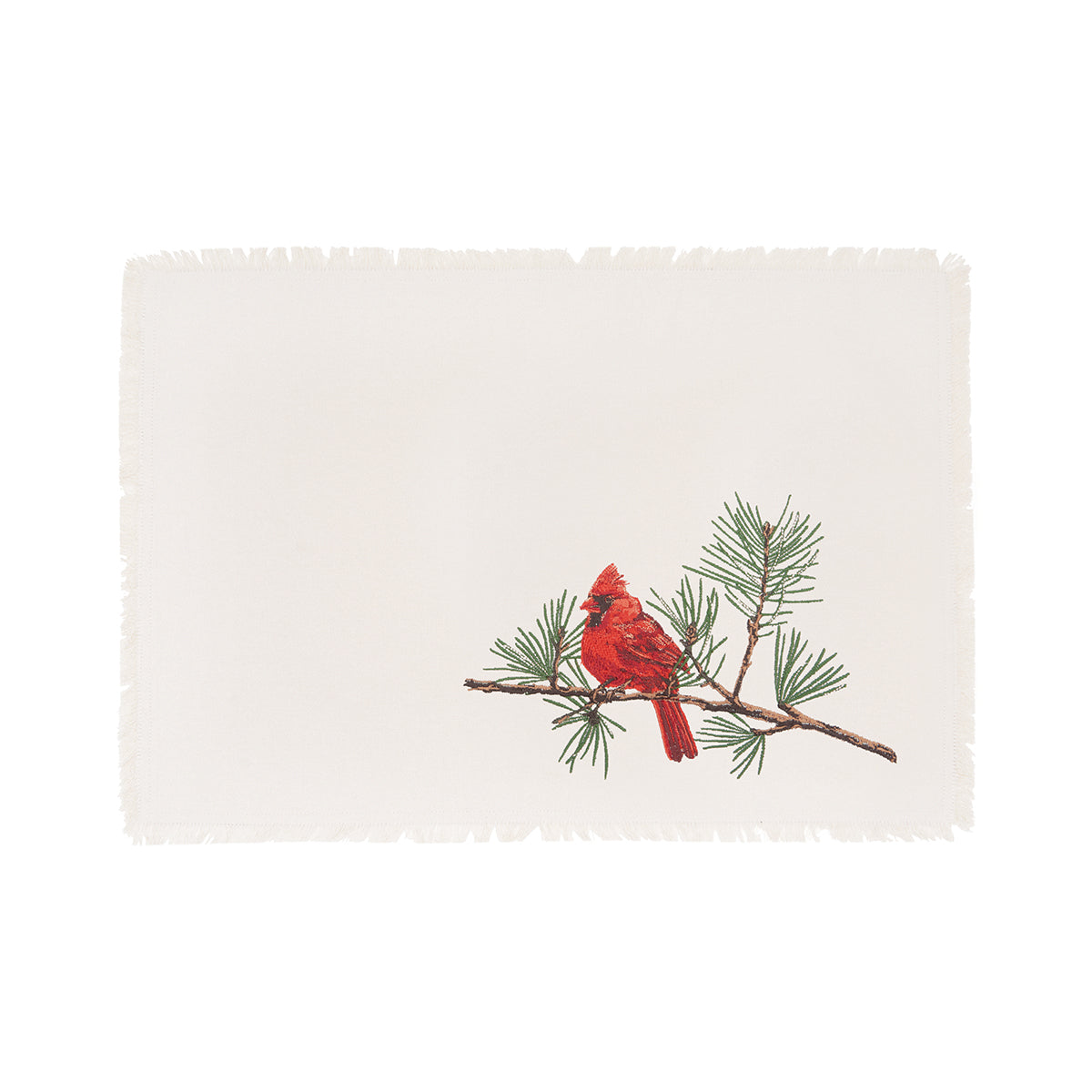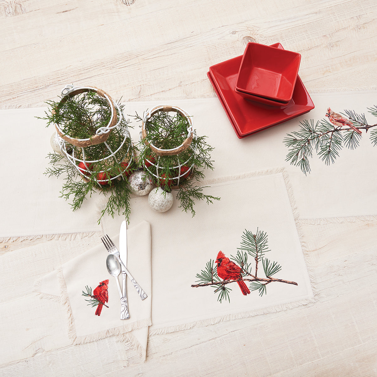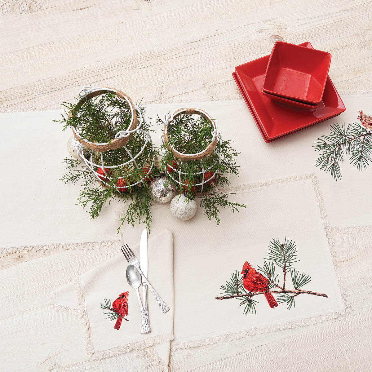 Unveil the subtle elegance of the Cardinal and Branch Table Linens, perfect for adding a touch of holiday charm to any home. Each piece is intricately embroidered with bright red cardinals perched among classic holiday pine branches, creating a scene that embodies the festive spirit. The vibrant reds and greens bring a warm, cheerful feel to any table setting, while maintaining a refined, understated look. Delicately trimmed with fringe, these linens are ideal for holiday gatherings or everyday use, adding a quiet yet festive charm to any occasion. Bring the beauty of the season to the table with these lovely and versatile indoor table linens.
