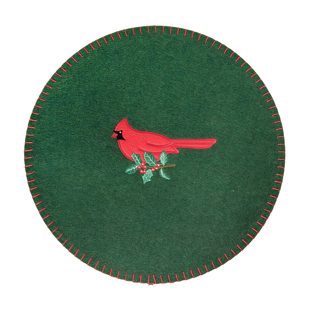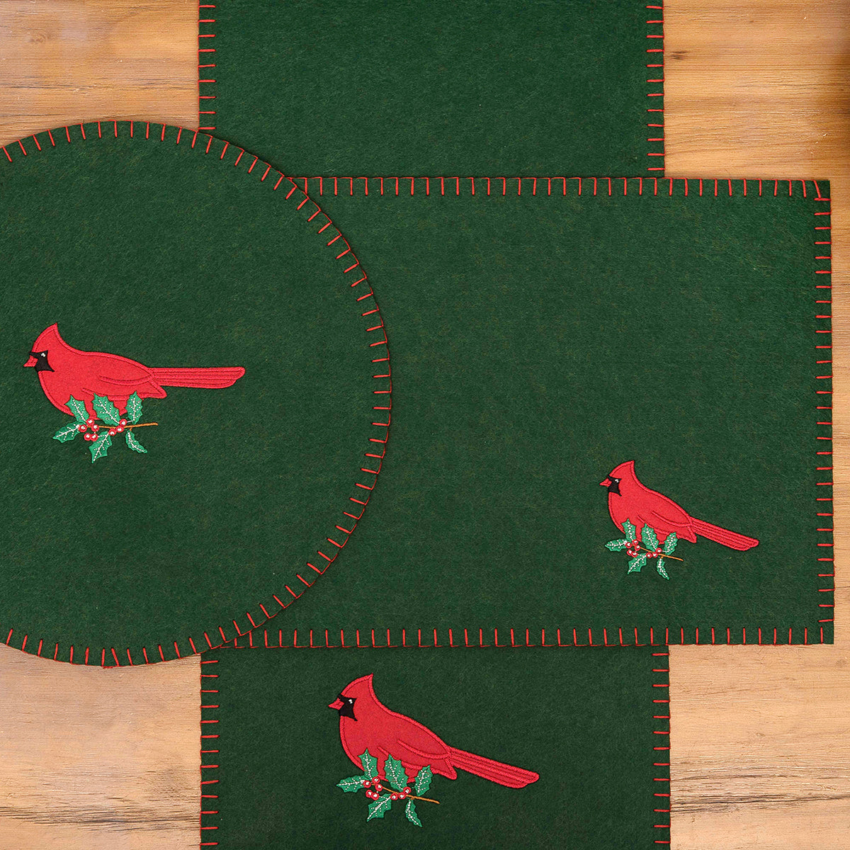The Cardinal Holly felt tabletop collection is a gorgeous addition to any holiday d cor. Featuring a forest green background punctuated with a bright red cardinal sitting on top of some holly berry leaves, the table linens are outlined with a red stitch edge. Spread some cheer with this seasonal classic!