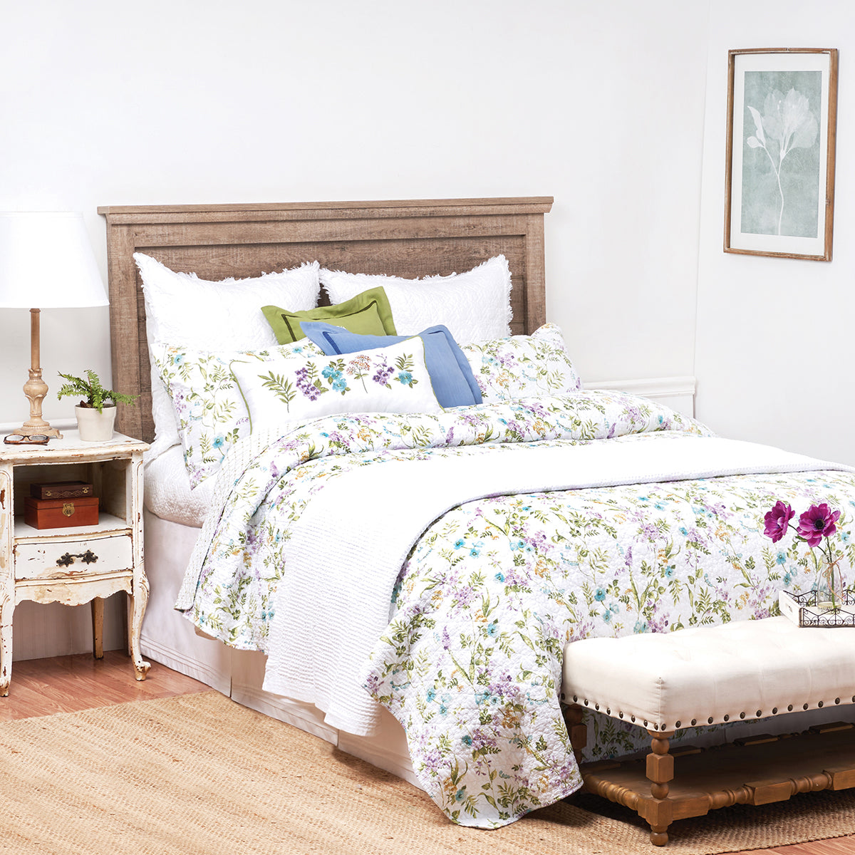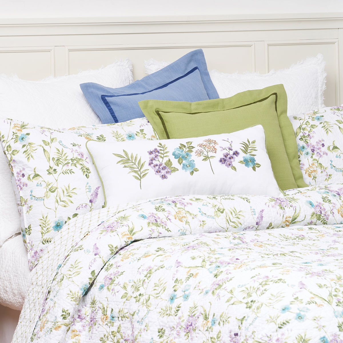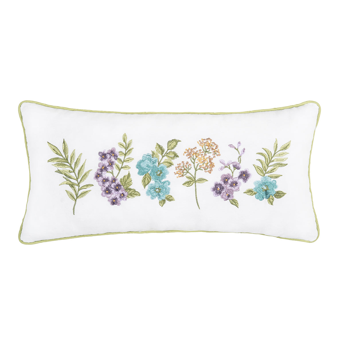 The perfect complement to the Carley quilted bedding collection, this exquisitely embroidered pillow features a row of six charming floral and botanical motifs in vibrant shades of purple, blue, yellow, and green delicately stitched on a crisp white background. Finished with a matching green trim, this pillow is a beautiful accent piece in any space.