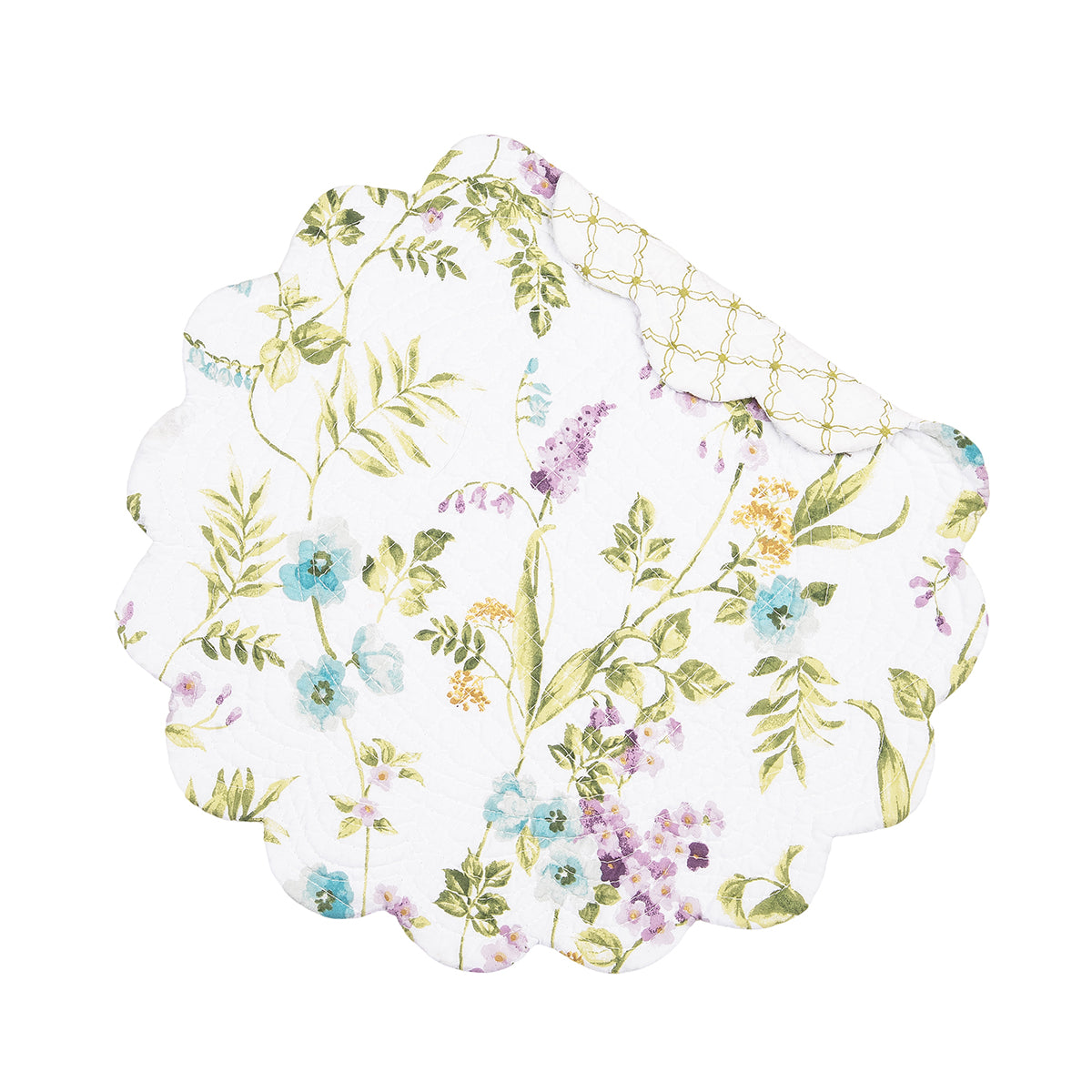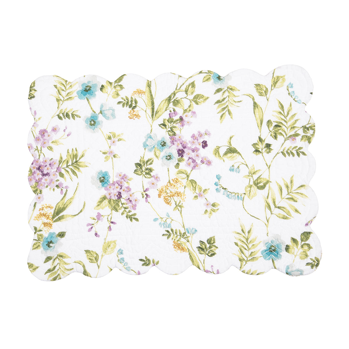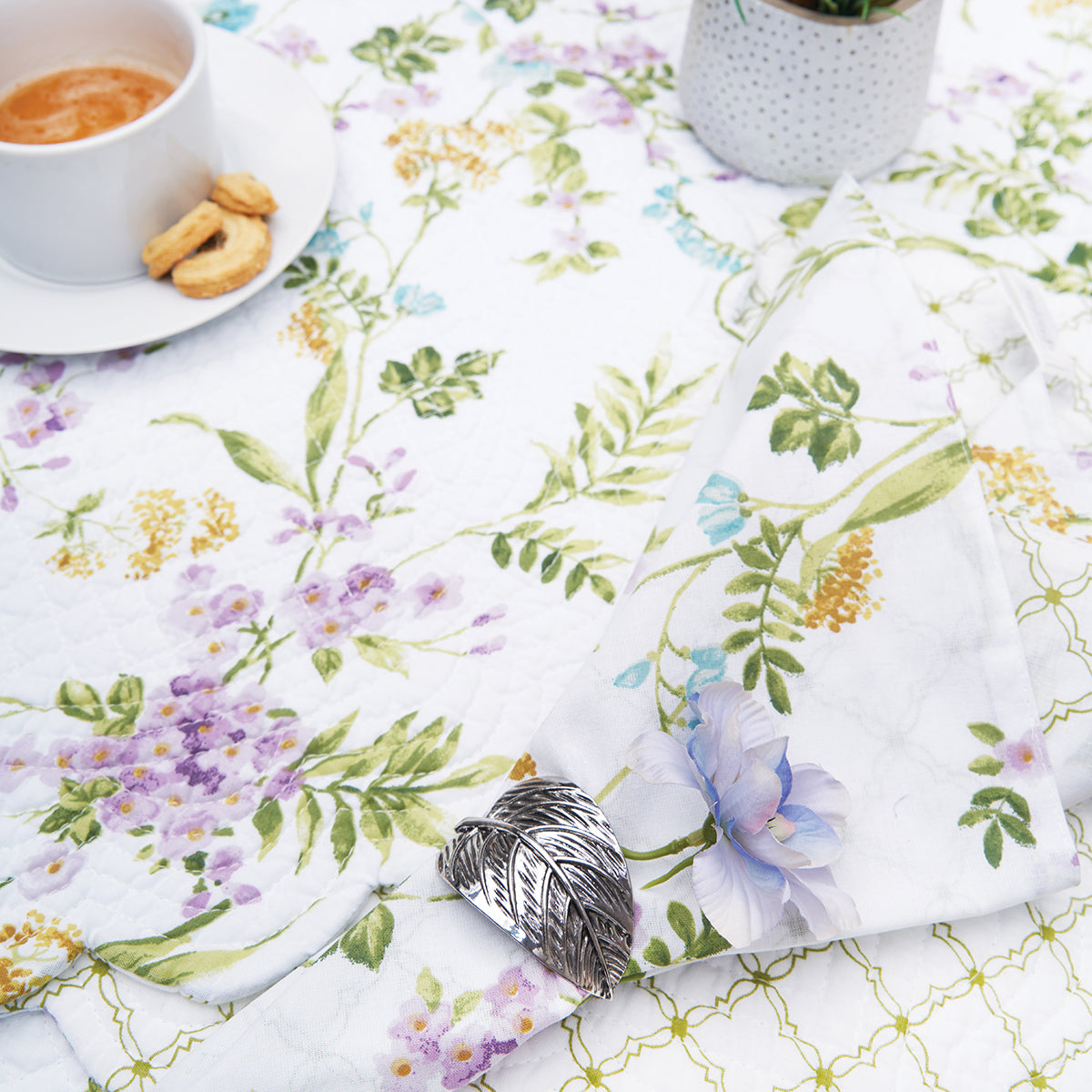 Embrace the beauty of spring all year round with the Carley quilted table linen collection and matching reversible napkin. The painterly flowers in a stunning array of blue, purple, and yellow on flourishing green stems evoke a sense of rejuvenation. For more styling options, these table linens reverse to a simple, yet charming yellow rosebud-style trellis pattern on a white background for more styling options. Love this look? Carley is also available as a bedding collection.