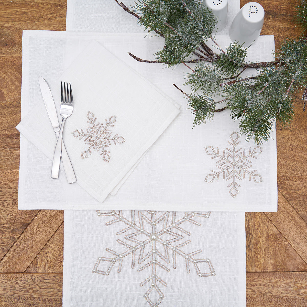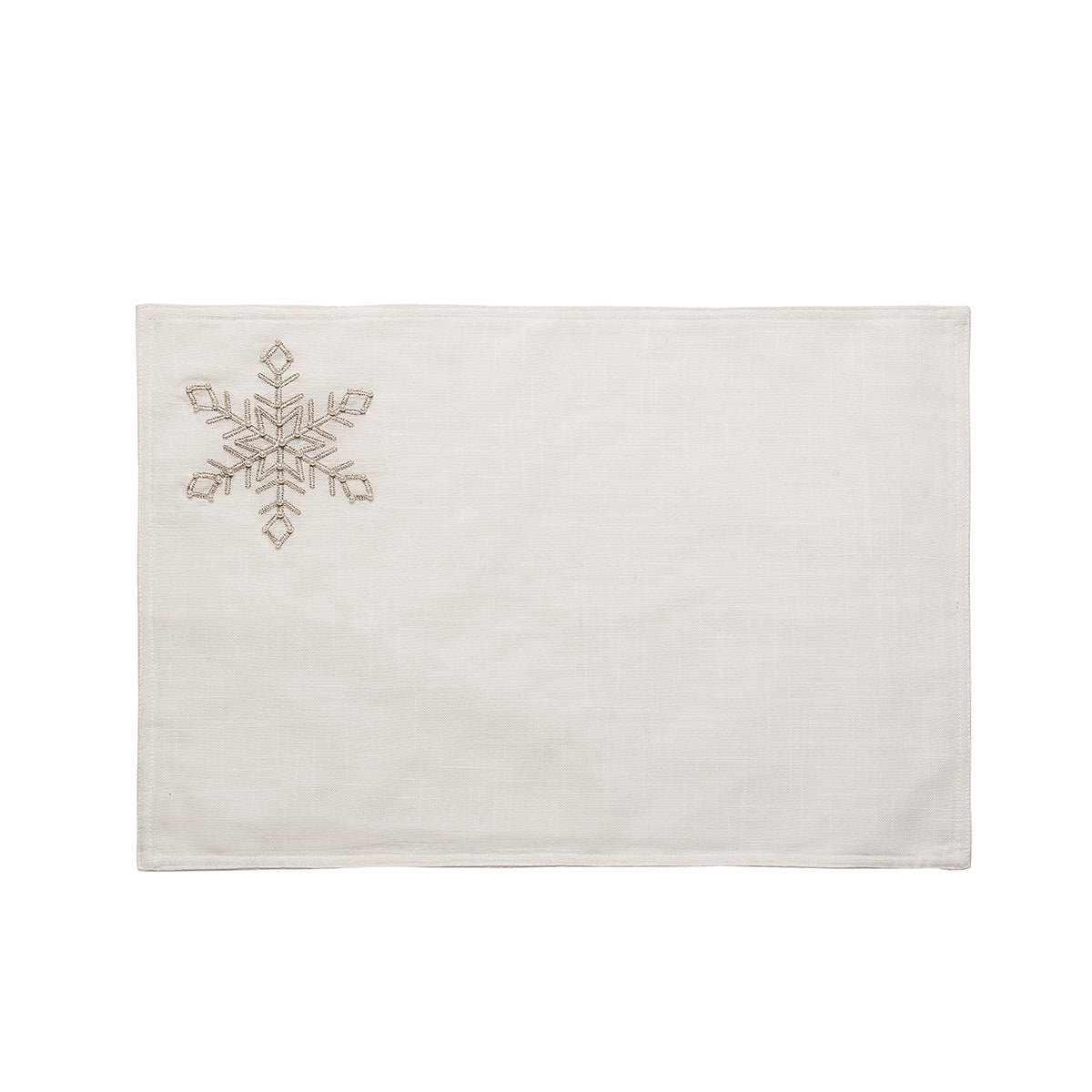 Bring a magical winter scene inside your home with this stunning and sophisticated Champagne Snowflake embellished tabletop collection. Featuring a snow-white background embellished with a single, silver snowflake, this collection is sure to make your dinner parties feel like a winter wonderland.