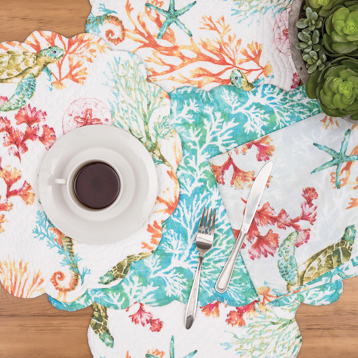 Let Chandler Cove transform your tablescape into a tropical adventure! A large scale coastal print brings the beach to you, no matter where you are, with vibrant color and iconic seahorse, starfish, coral, and sea turtle motifs. Chandler Cove reverses to a white coral on aqua and green negative pattern, perfect for a seaside paradise, a vacation rental, or a fun summer look at your breakfast bar. Finished with a scalloped edge, this tabletop collection is crafted of 100% cotton and hand guided machine quilting. Stains and spills are no problem, machine wash cold and tumble dry low for easy care. Love this pattern? The Chandler Cove pattern is also available in a bedding collection and window treatments.