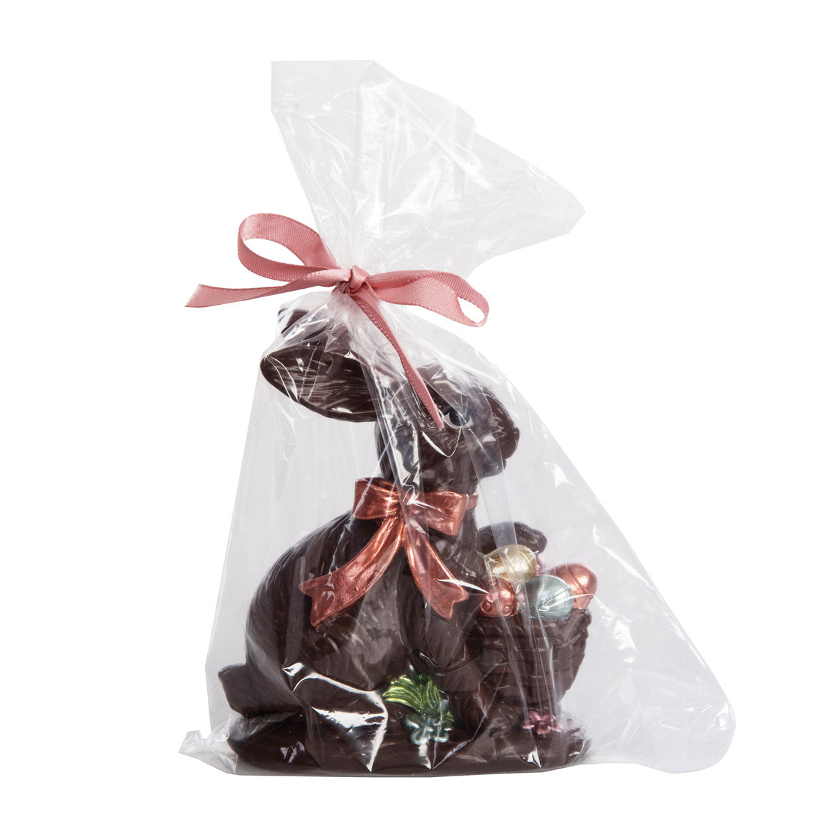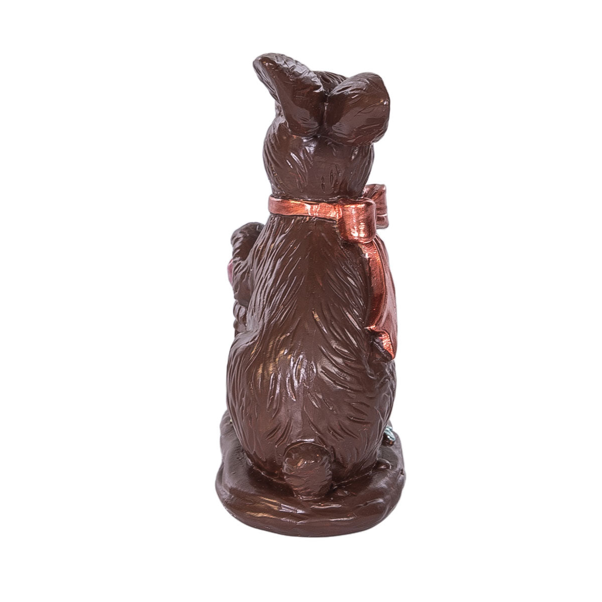 The Dark Chocolate with Eggs Bunny Figure is a beautifully crafted resin piece inspired by classic Easter confections. Designed to resemble rich, dark milk chocolate, this sitting bunny features a shiny bronze ribbon tied into a charming bow around its neck. In front of the bunny rests a basket filled with vibrant, glossy Easter eggs, adding a festive pop of color. Sealed in clear plastic for an authentic candy-shop look, this delightful figure is the perfect addition to springtime decor, Easter baskets, and seasonal displays.