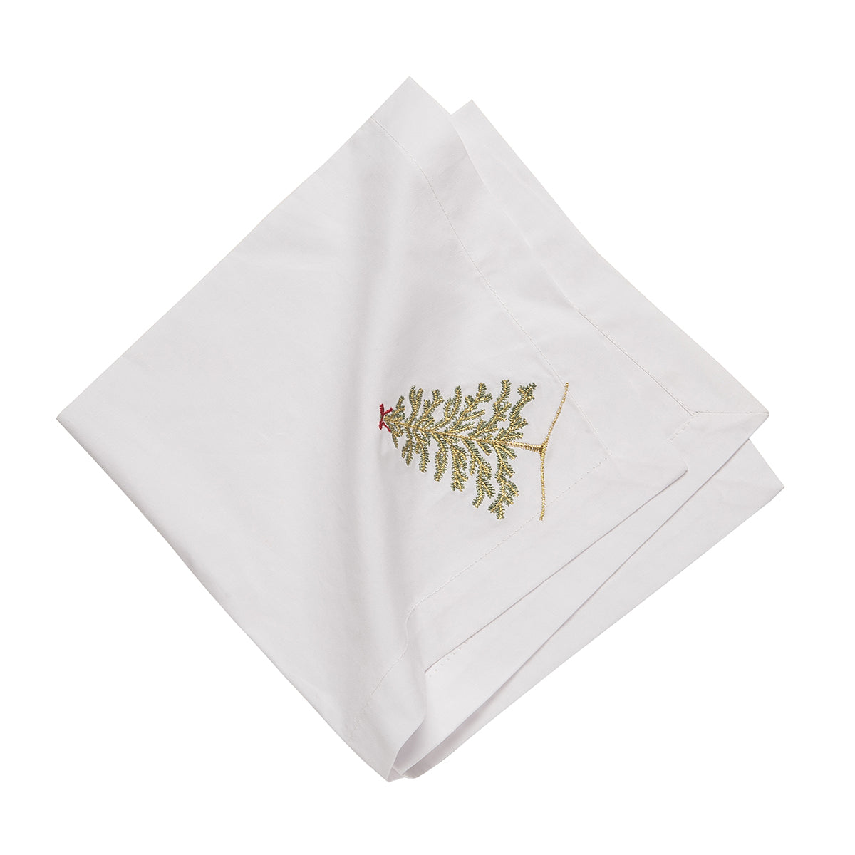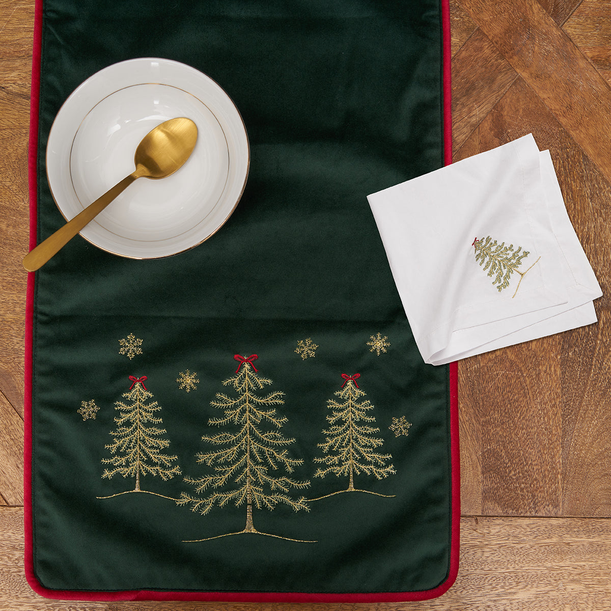 Surround yourself with a magical winter wonderland courtesy of the Christmas Tree Forest embroidered tabletop collection. With a festive forest green runner, adorned with mesmerizing gold and green embroidered trees and snowflakes capped off with delightful red bows, plus a matching white napkin with a gold and green embroidered tree and red bow topper, this holiday collection is the perfect way to blissfully bring in the season!