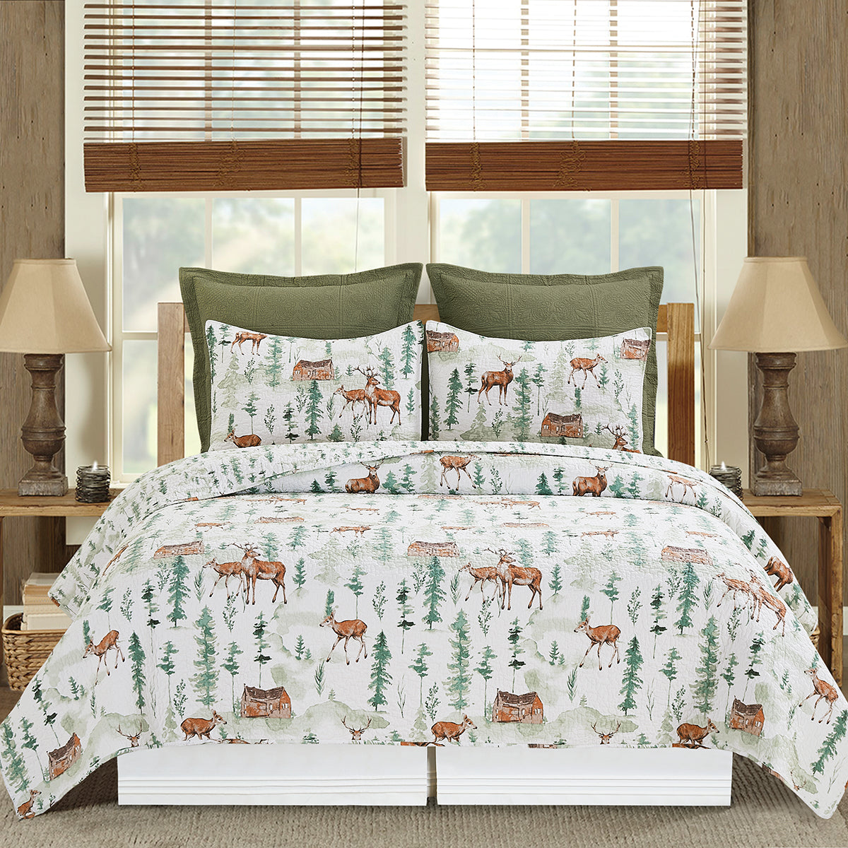 Bring comfort into your cabin in the woods with the Christopher Forest quilt set. This luxury oversized quilt features a cabin scene with a buck and fawn exploring an evergreen forest. This quilt reverses to a coordinating plaid pattern and the entire set is machine washable for easy care.