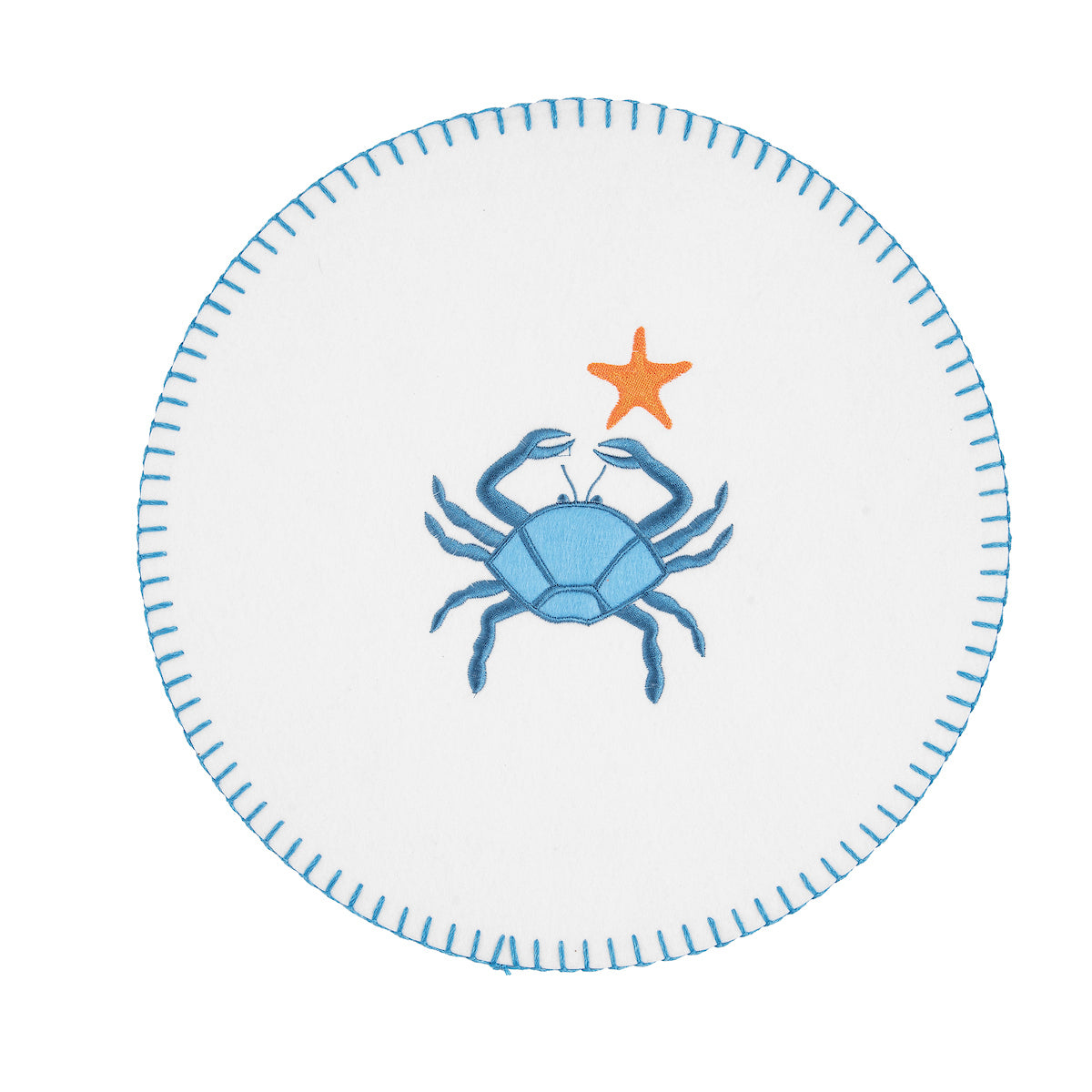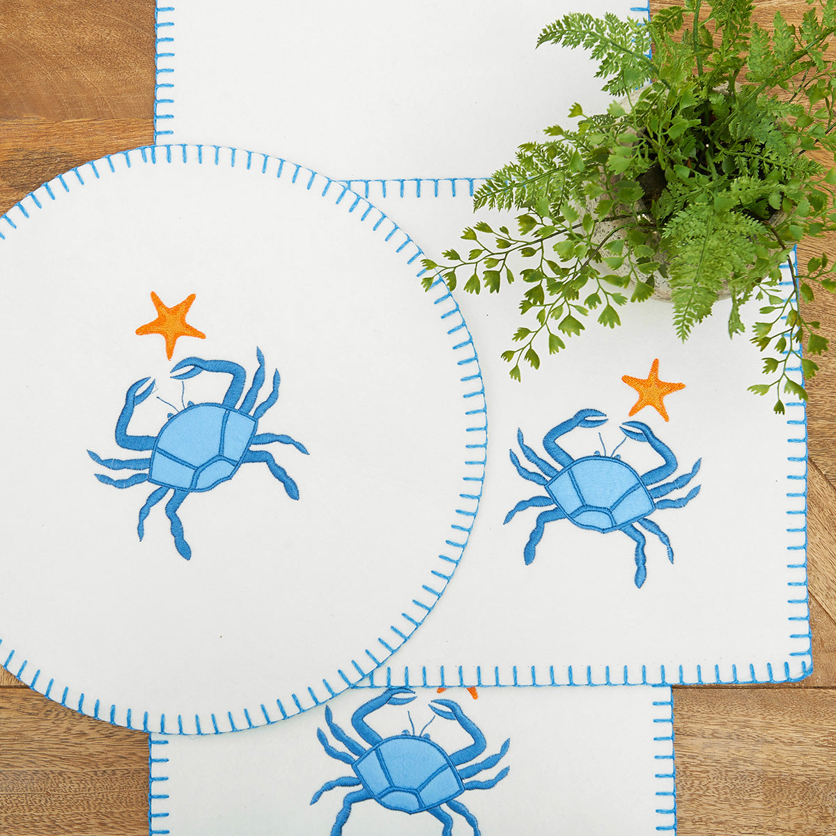 Give your dinner table a playful makeover with our Crab Felt Table Linens. Perfect for seafood-themed dinner parties, its soft felt, blanket stitch edge, and white background featuring a blue crab and orange starfish will make a splash with your coastal decor!