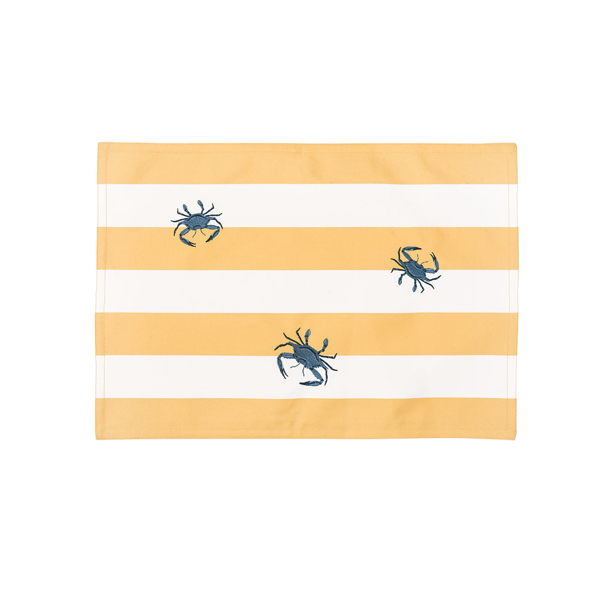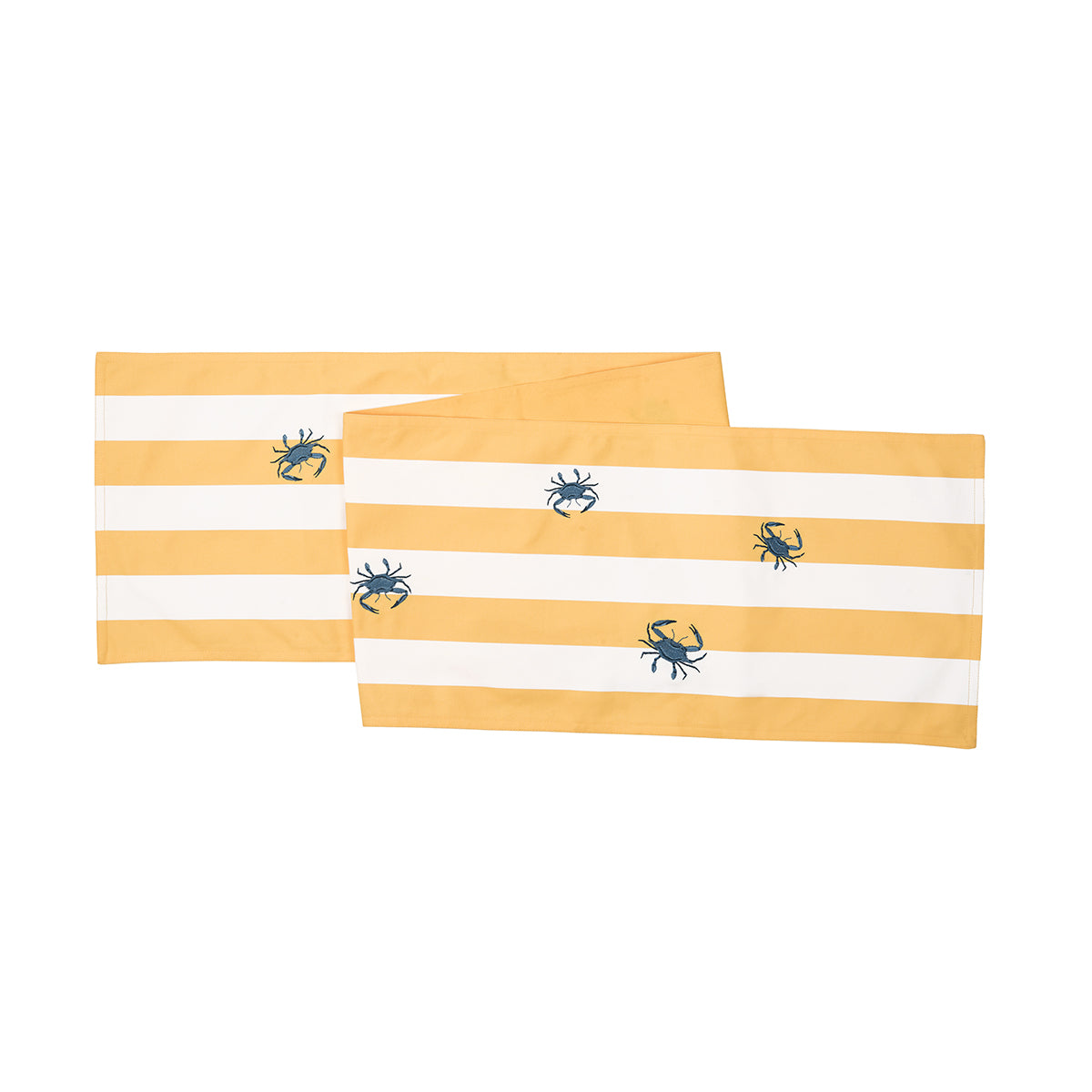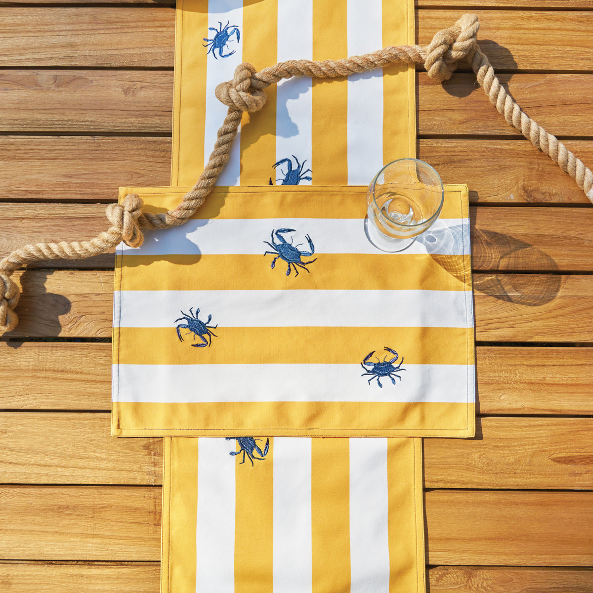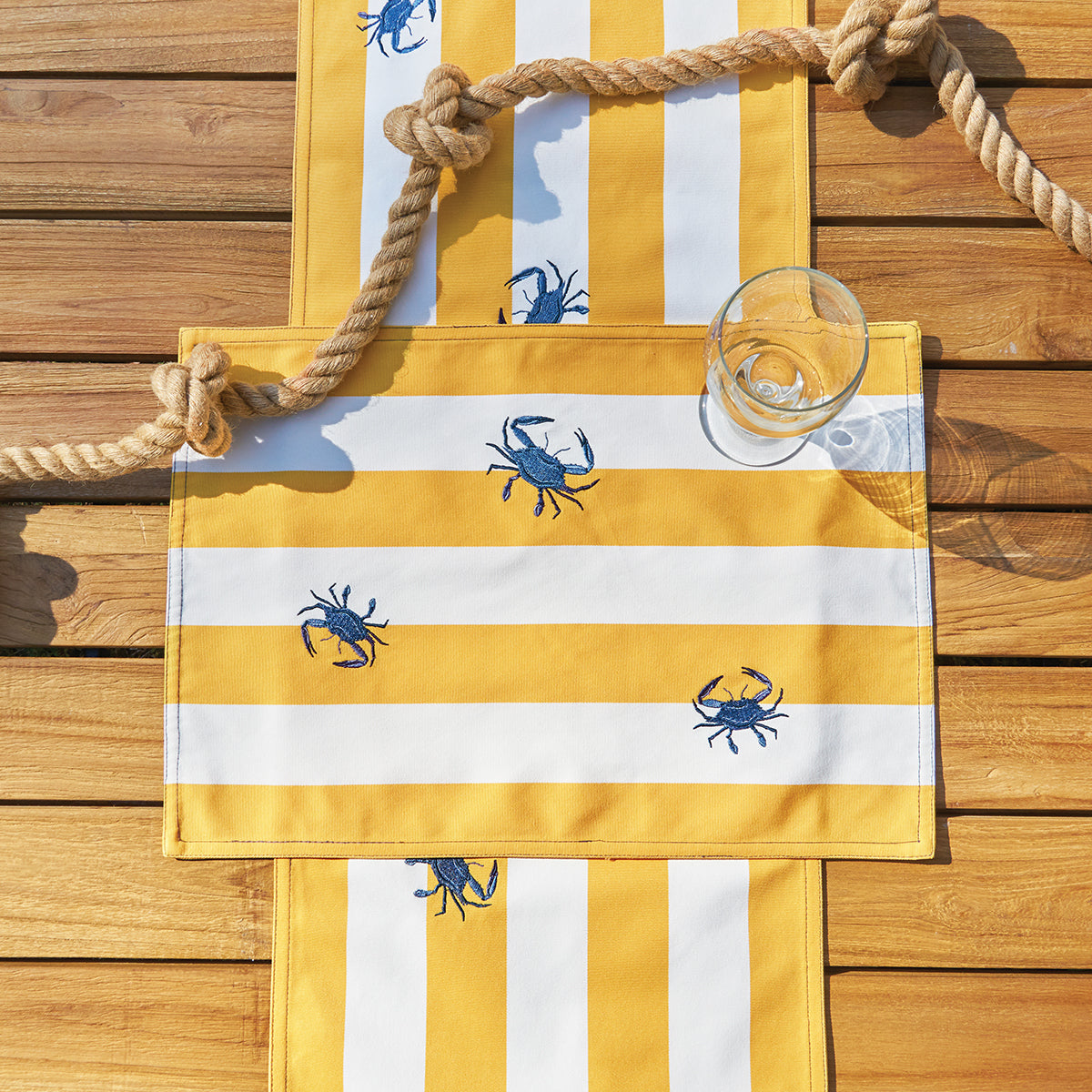 Bold yellow and white stripes evoke a quintessential coastal vibe for tabletops, complemented by embroidered blue crabs that set the stage for a perfect beach house gathering.
