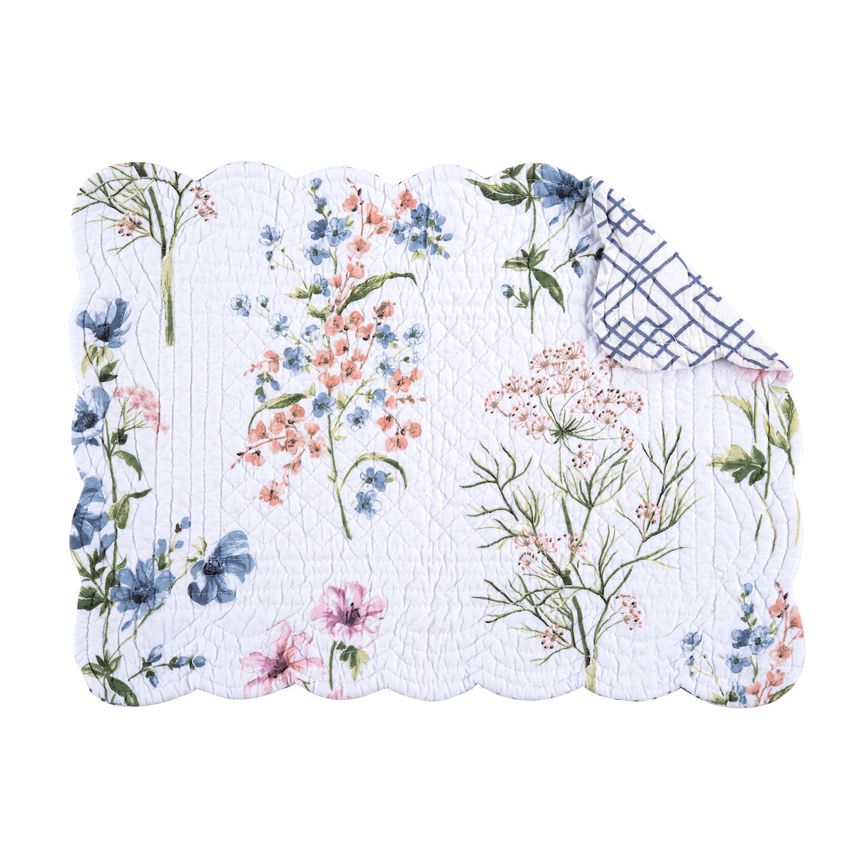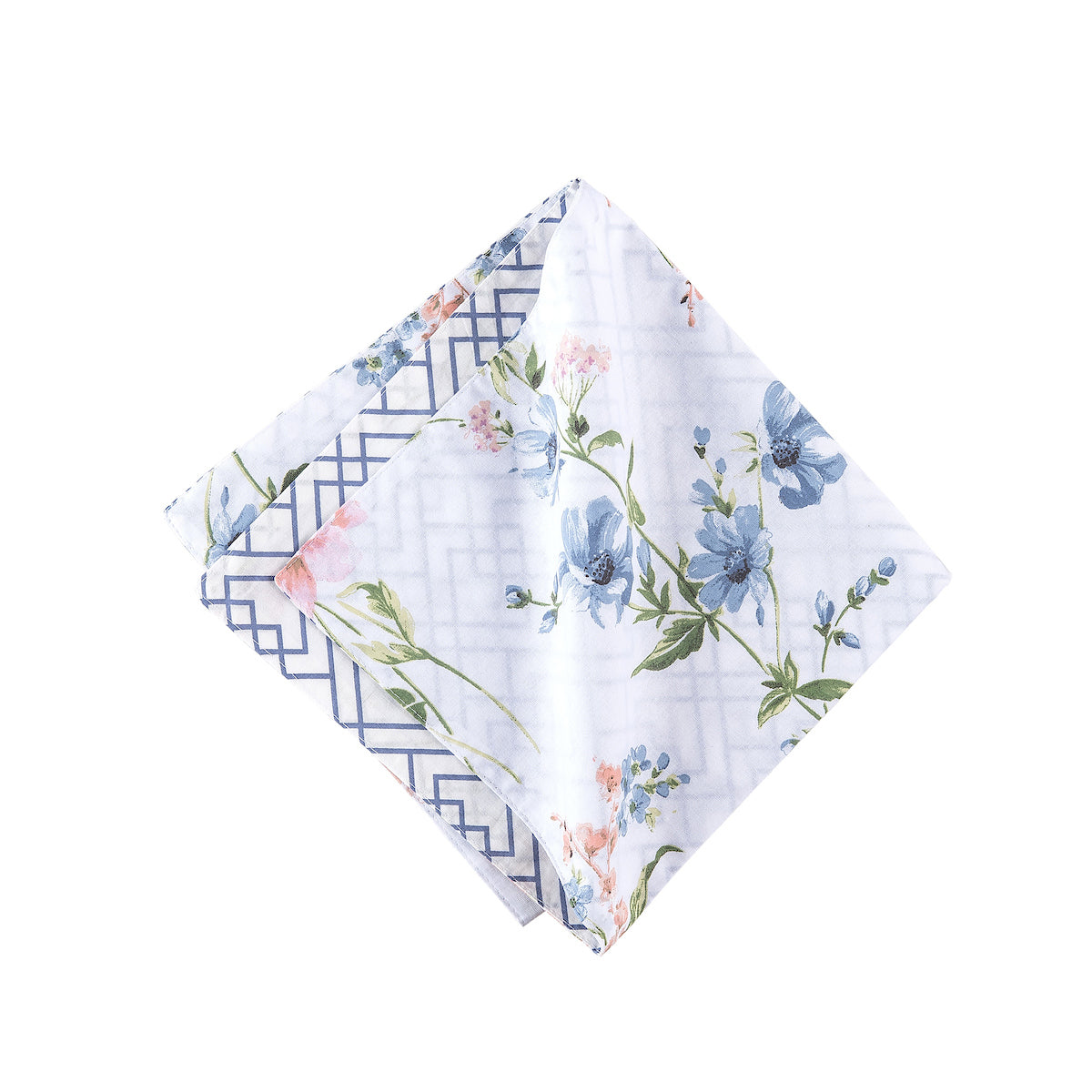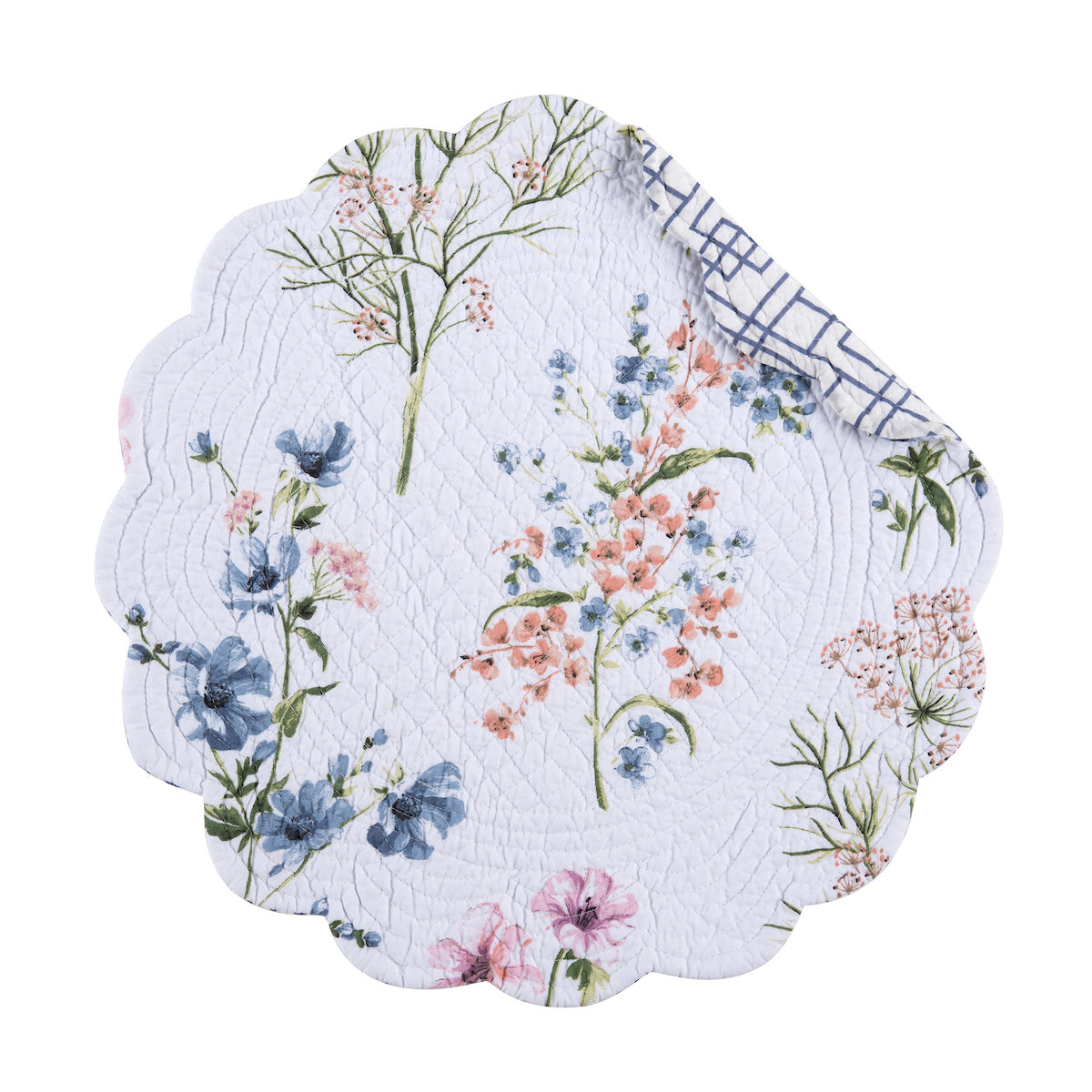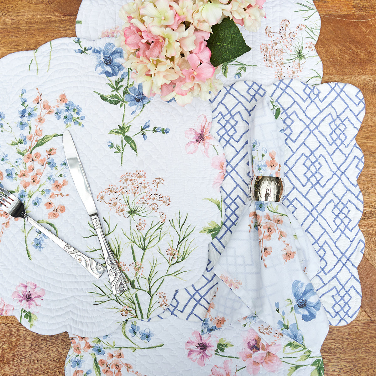 Dream of your spring garden with the Cynthia tabletop collection. This large-scale floral botanical print with vibrant pink and blue blooms easily brightens any dining area.