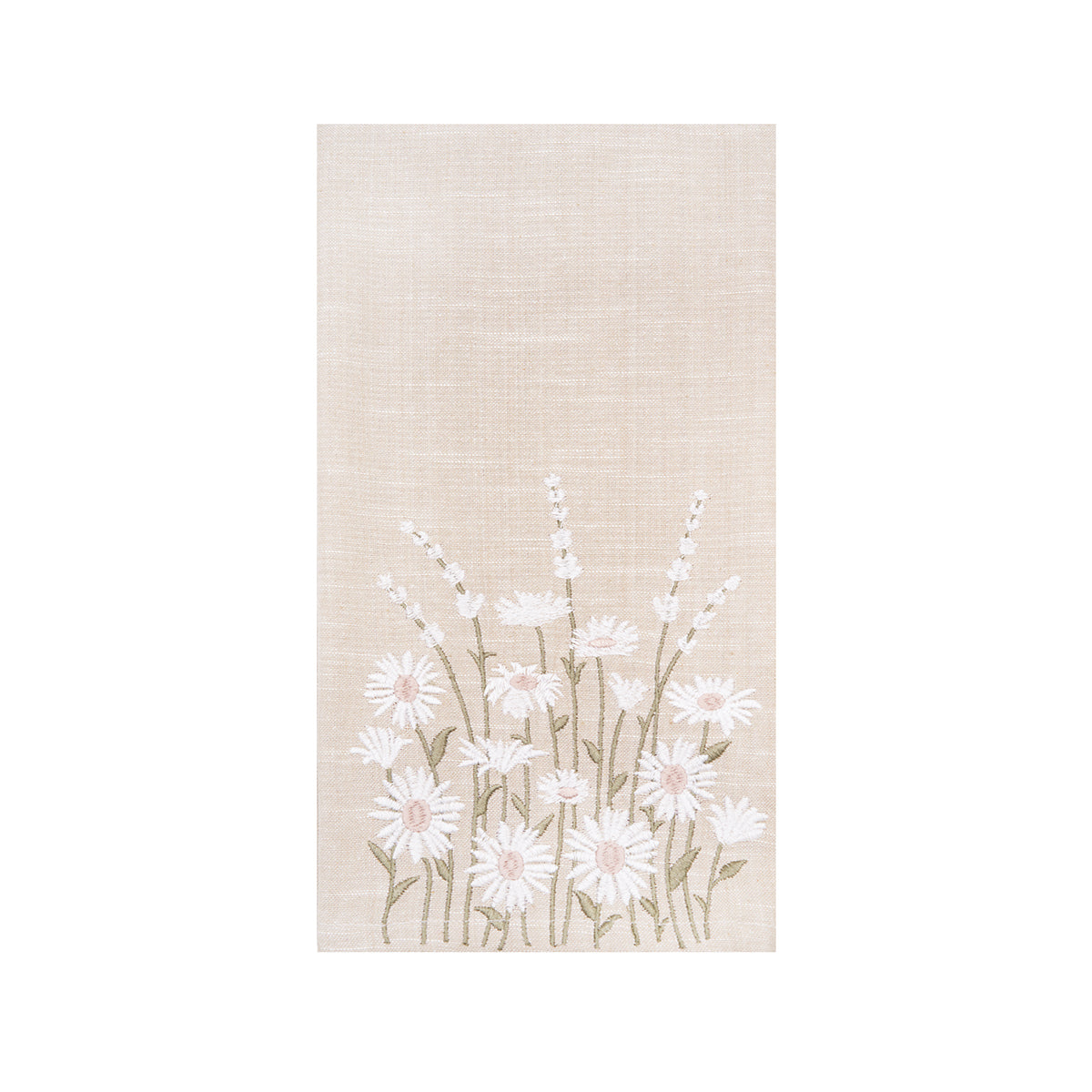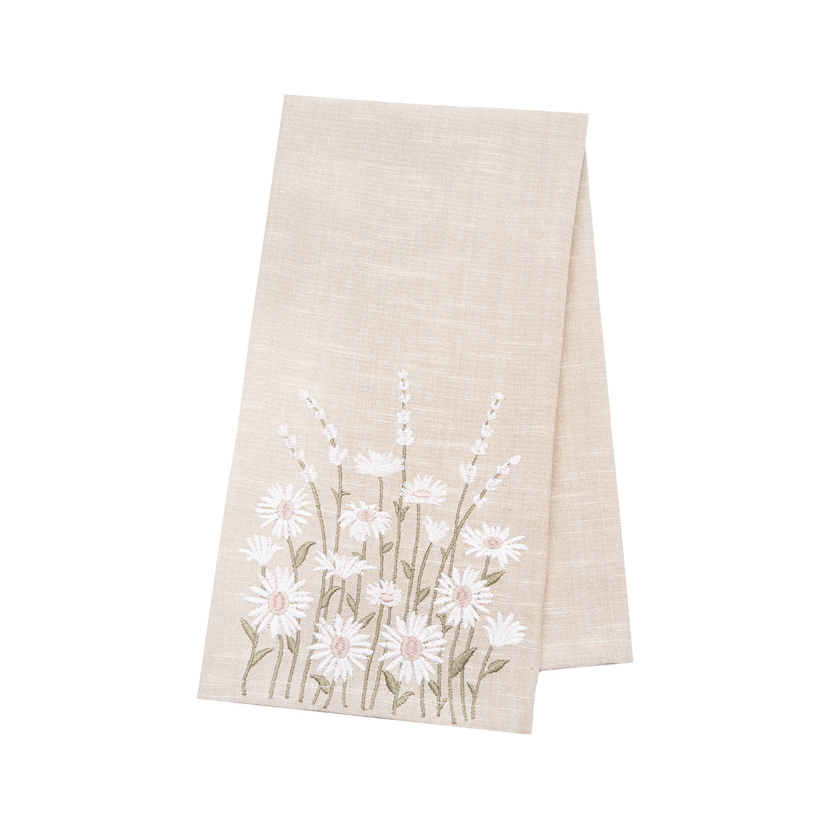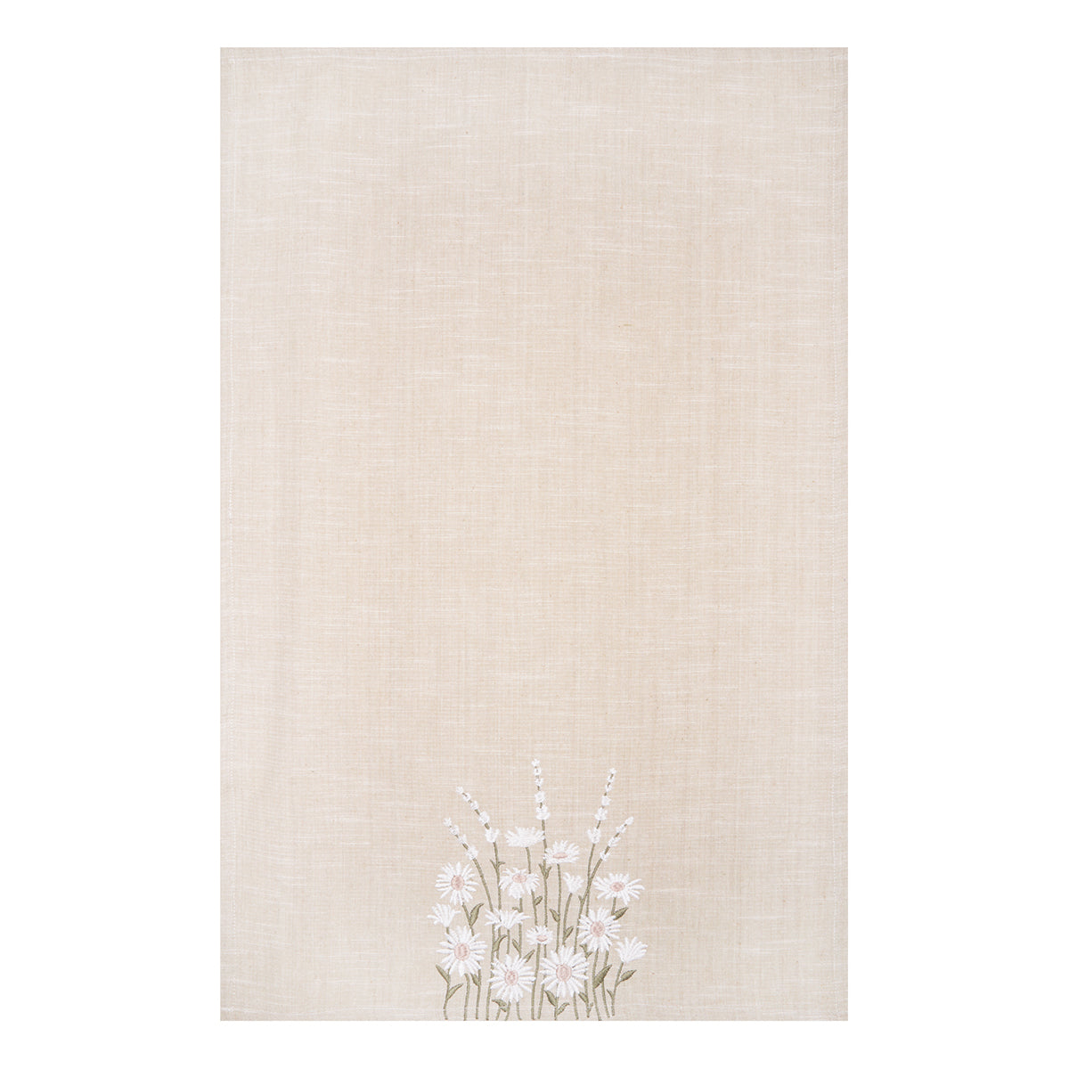 For an elegant kitchen towel with a neutral background, this embellished towel features delicate daisies blooming from the bottom and gracefully extending toward the top. This timeless floral display adds an elegant touch suitable for year-round decor.