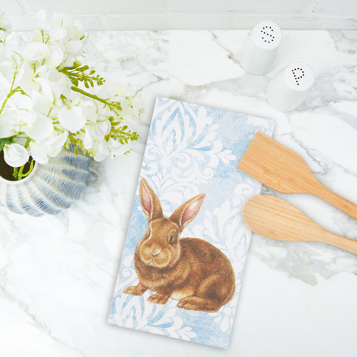 This charming kitchen towel features a beautiful blue damask background, offering a touch of classic elegance, paired with a realistic painterly image of a bunny that adds a whimsical, nature-inspired flair. Perfect for adding a refined yet playful touch to your kitchen, it blends traditional and contemporary styles seamlessly. Ideal for spring or Easter décor, this towel is not only functional but also a stylish accent that will brighten up your space. Crafted from soft, durable fabric, it's a practical and decorative addition to your home, whether for everyday use or special occasions.