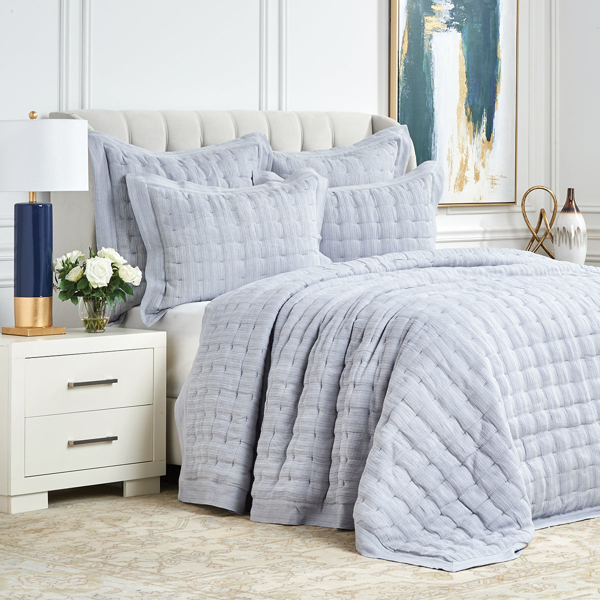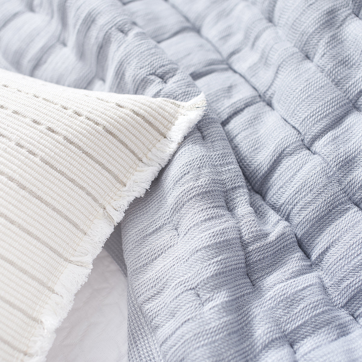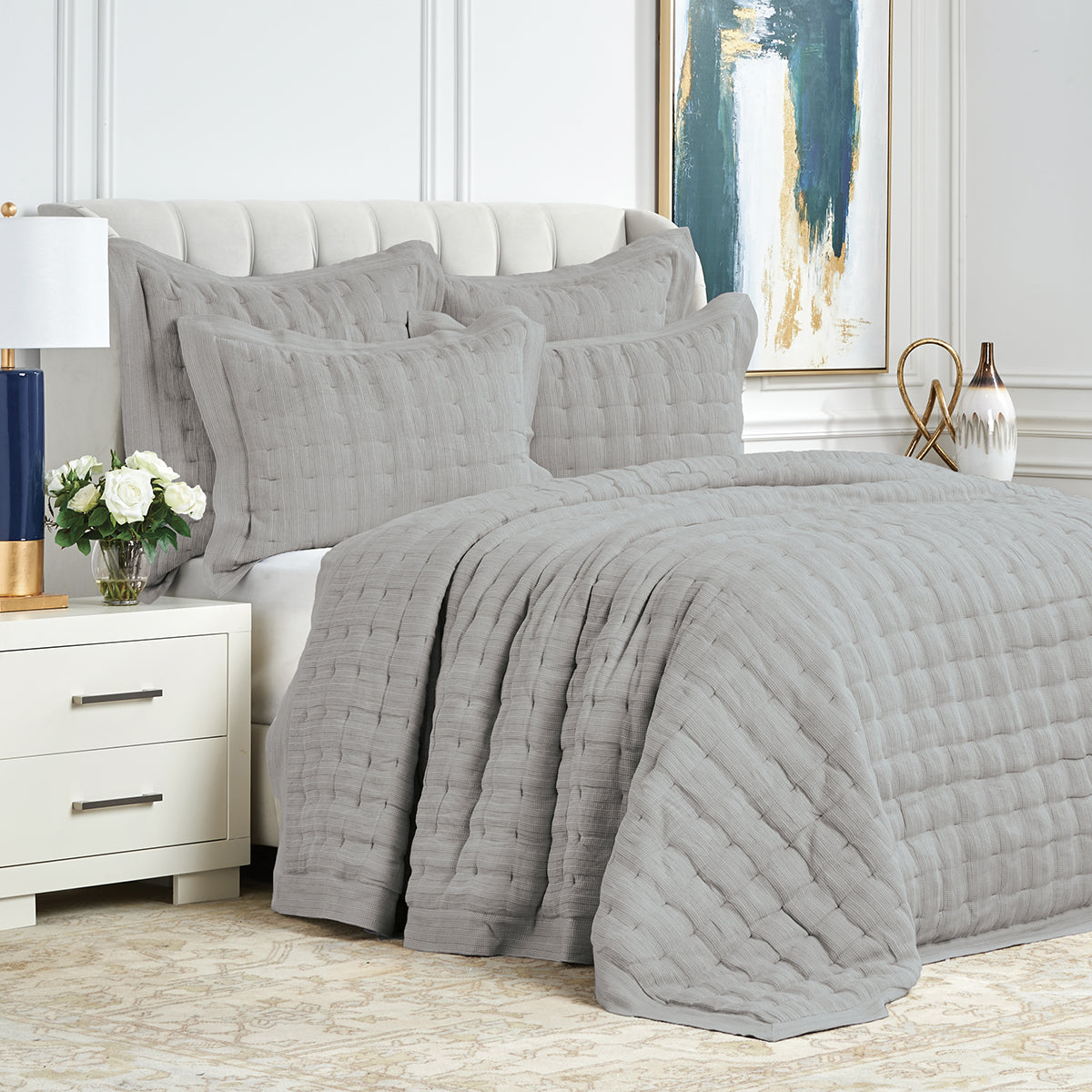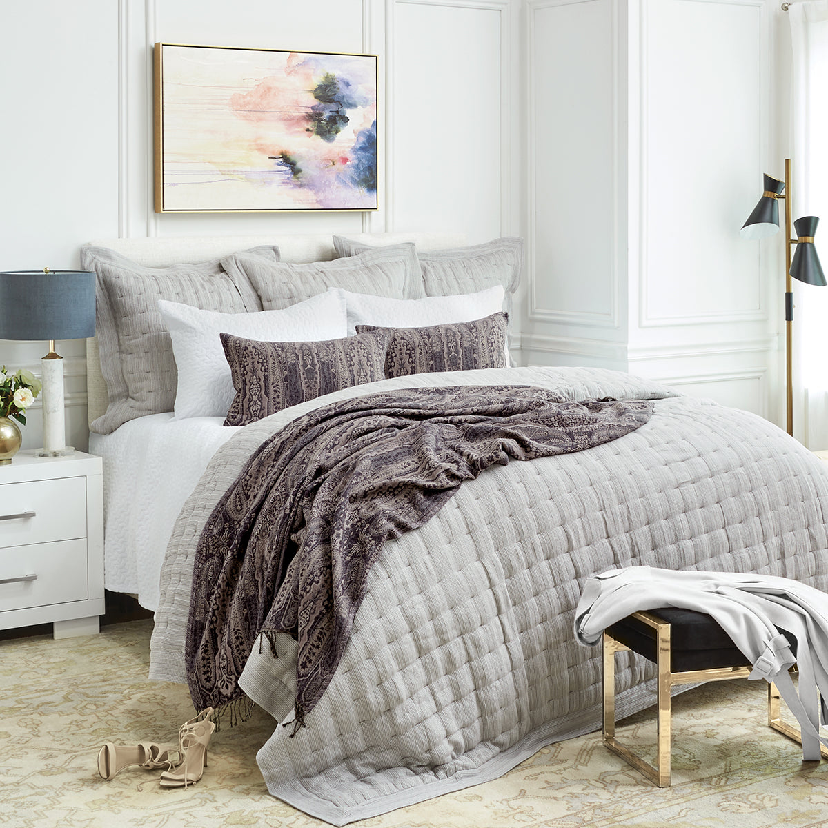 The Danette collection showcases textured vertical stripes and crisp tailored style converging in a harmonious blend of comfort and sophistication. Crafted from a luxurious cotton and rayon blend, this collection offers a unique and inviting touch that transforms your bed into a statement of style. Layer different looks on the Fog and Shale quilts or create a cohesive ensemble by pairing with the matching shams. The versatility of this collection allows you to express your personal style and create a customized bed that suits your taste.