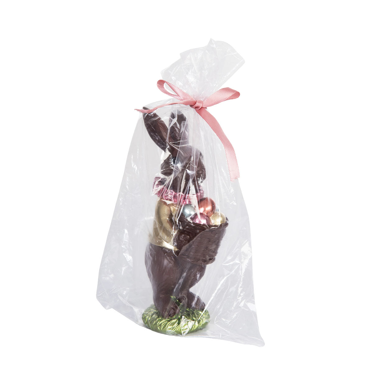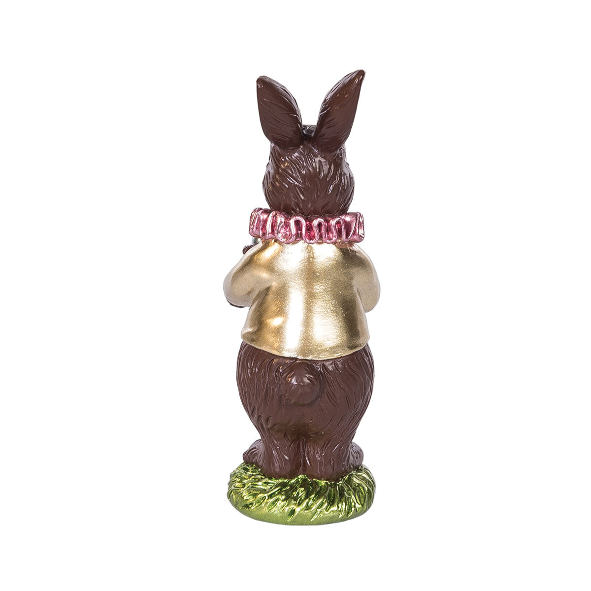 Elevate Easter decor with this Dark Chocolate with Eggs Bunny Figure, designed to resemble a decadent holiday confection. With a smooth, rich cocoa-colored finish, this elegant bunny is dressed in a vintage-inspired frilly collar and a gleaming gold shirt, adding a touch of nostalgic charm. Holding a bundle of vibrant, shiny Easter eggs and standing atop a small patch of lush green grass, it perfectly captures the spirit of the season. Encased in clear plastic for an authentic candy-shop look, this resin figure is a delightful addition to Easter baskets, table displays, and springtime vignettes.