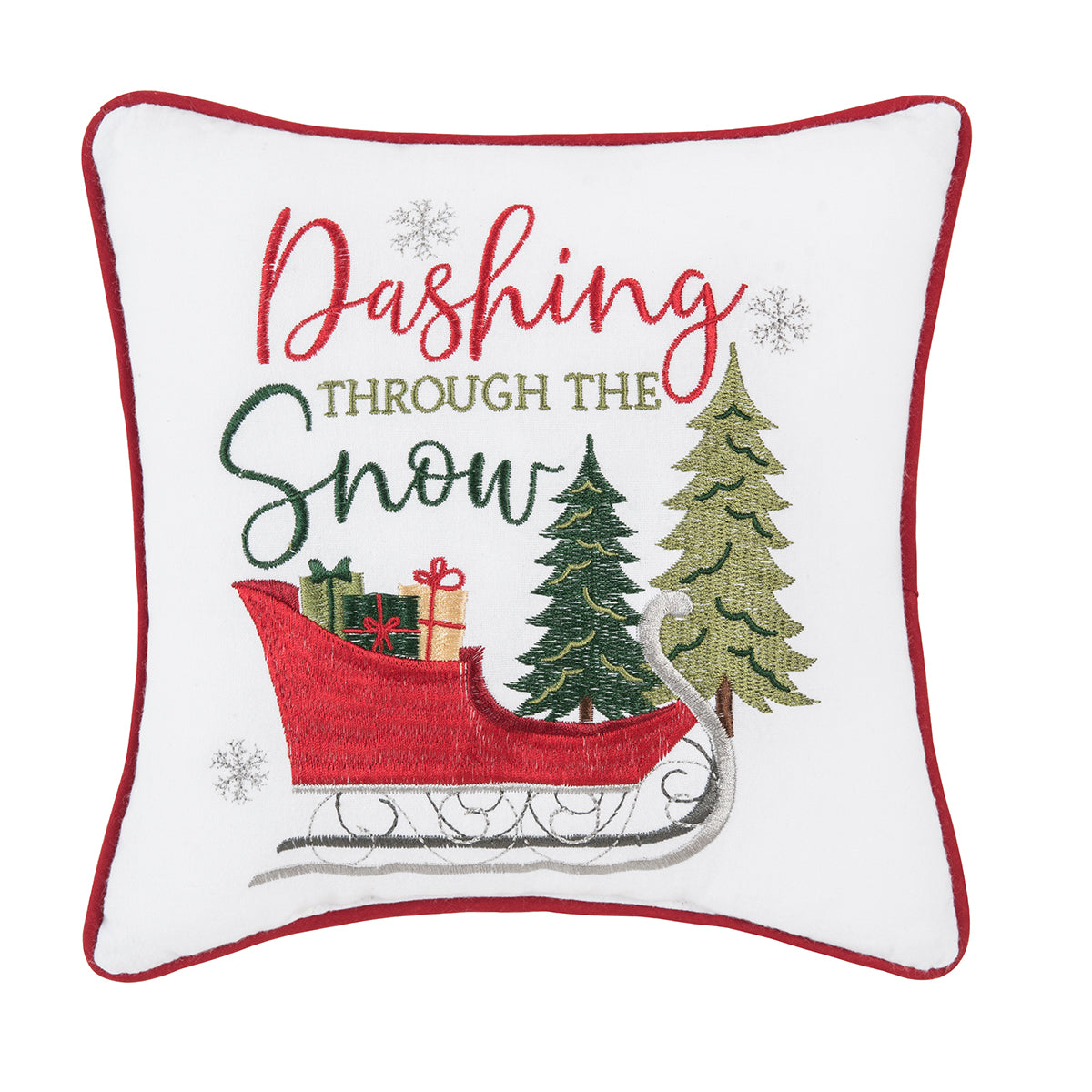 Bring festive cheer to your decor with this delightful white pillow, trimmed in vibrant red. The phrase 'Dashing Through the Snow' is playfully embroidered above a beautifully illustrated red sleigh filled with presents, gliding through a charming forest scene. This pillow captures the magic of the holiday season and makes a perfect accent for your living room, bedroom, or cozy reading nook, adding warmth and a touch of whimsy to your home.