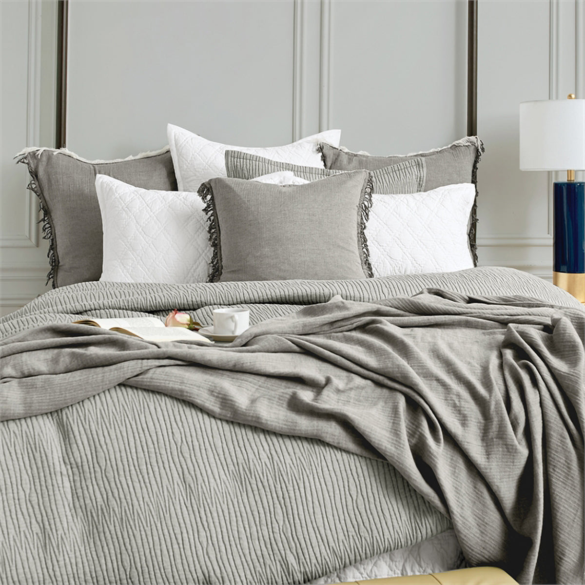 The Declan Ash collection features a calming grey colorway crafted of 100% double-faced cotton gauze. Two complimentary thread colors come together and frame this collection in a multi-toned drawn edge. The simple yet elegant luxury of the Declan Ash Bed Throw brings a warm softness to any space.