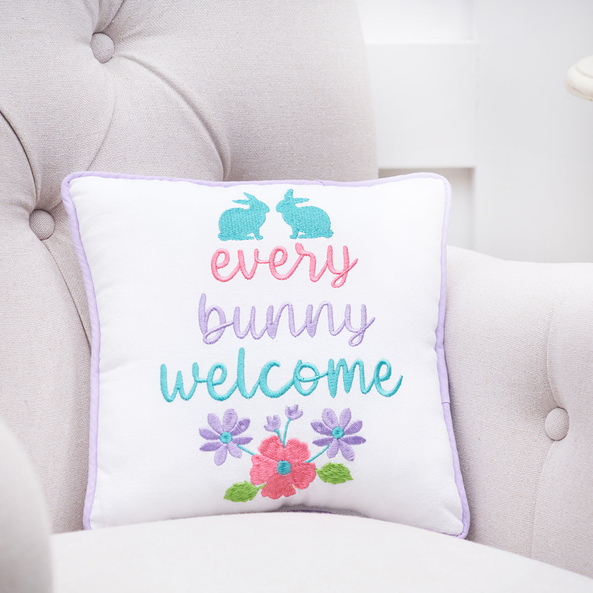 Welcome spring into your home with this charming embroidered mini pillow, featuring the sweet phrase "Every Bunny Welcome" in delicate spring colors. Two adorable bunnies perch playfully on top of the embroidered lettering, while a lovely group of flowers blooms below, adding a touch of seasonal charm. Finished with a soft lavender trim, this pillow is perfect for adding a subtle pop of color to your Easter décor. Whether displayed on a chair, shelf, or tucked into a festive arrangement, this petite accent pillow is a delightful way to celebrate the season with warmth and whimsy.