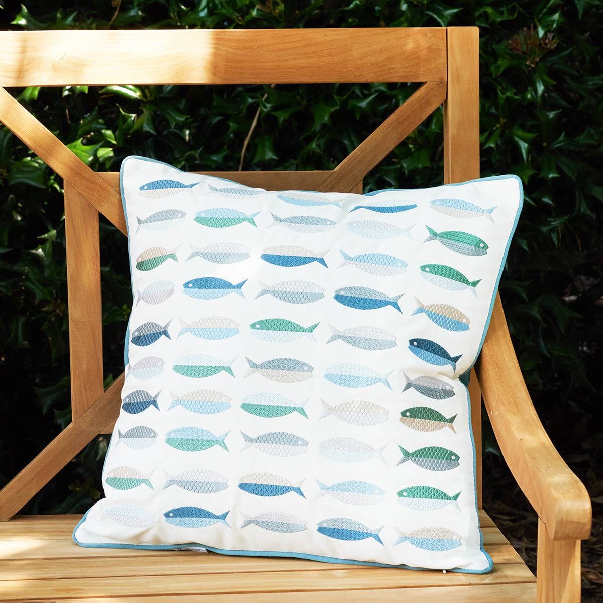 With cool sea glass tones, this fish pattern pillow is the perfect accent to that coastal or lakeside retreat. Heavily embroidered on performance Olefin fabrics, it can be used indoors and out. Designed to resist fade and cleaning abrasion.