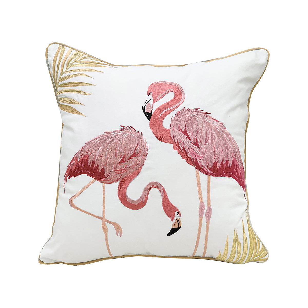 Heavily embroidered flamingos with touches of gold and silver threads for an elegant tropical look. Sun-fade resistant panels and threads this pillow is made outdoor tough.