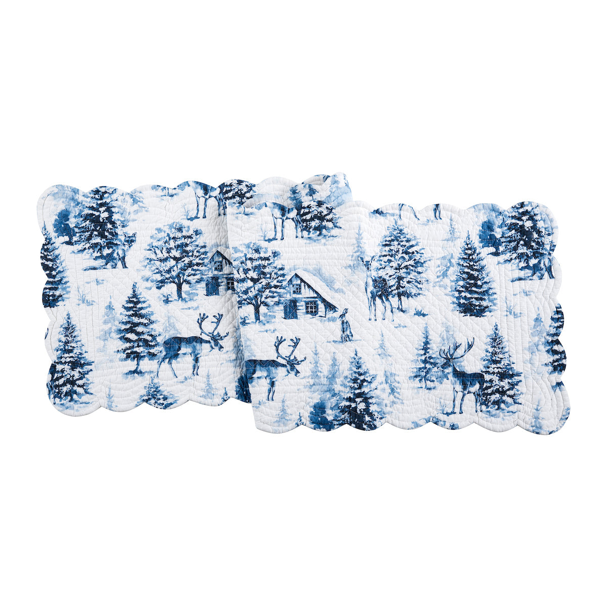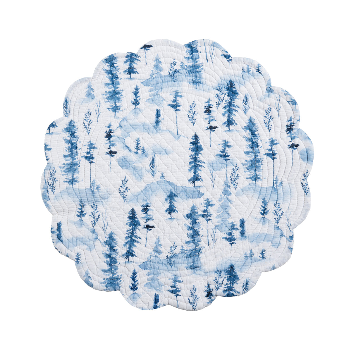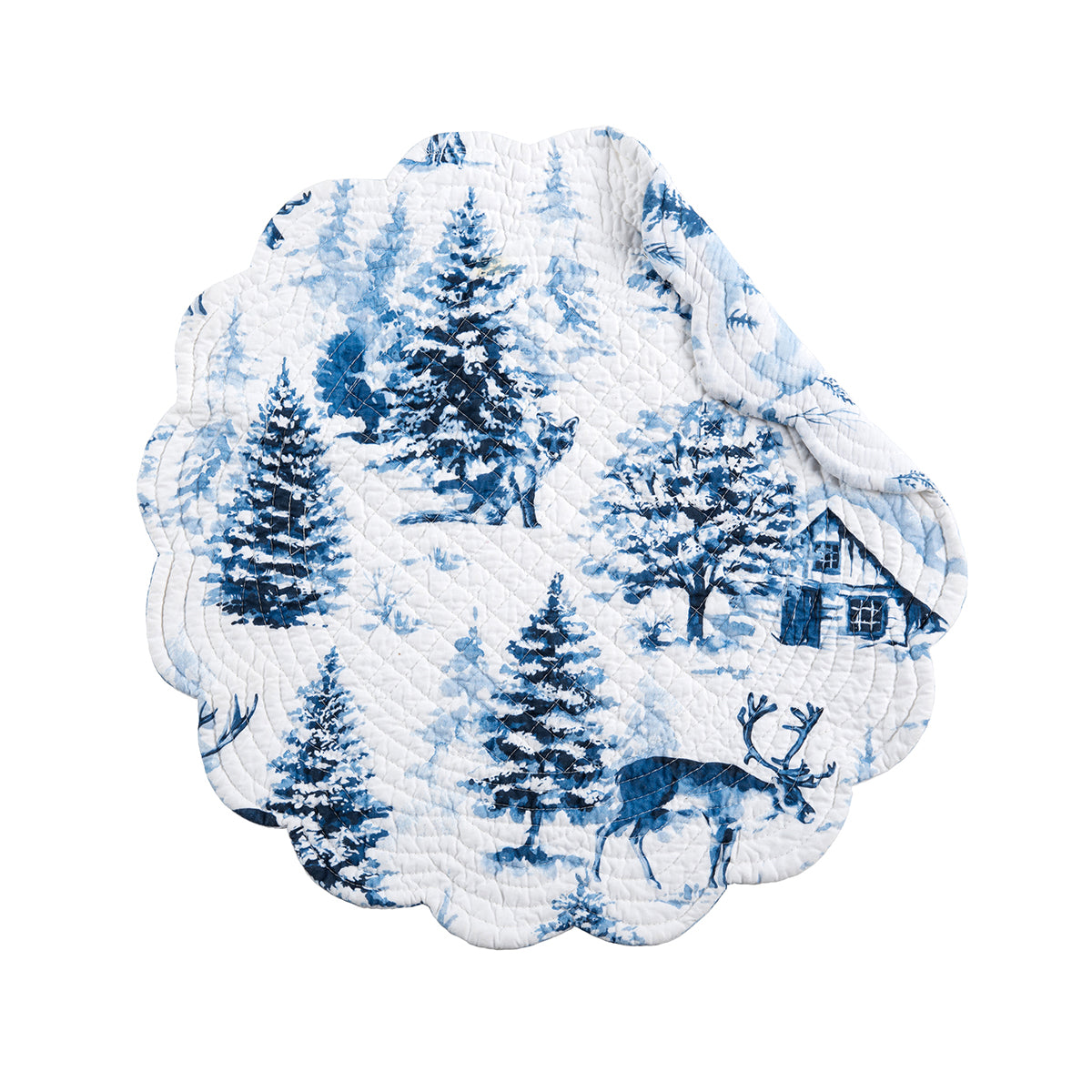 Try a fresh new holiday palette with the Frasier tabletop collection. Featuring a forest scene of a snow-covered cabin and winter wildlife in hues of Victorian blue, Frasier makes it easy to decorate for the winter season. Reverse to a serene alpine forest suited for a ski lodge getaway.
