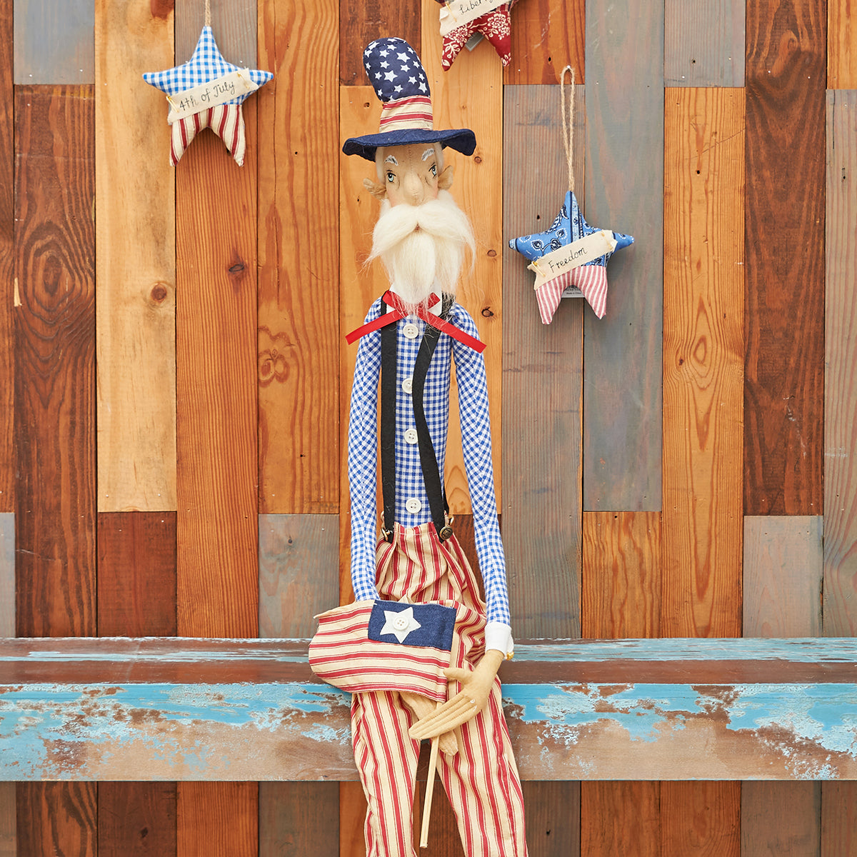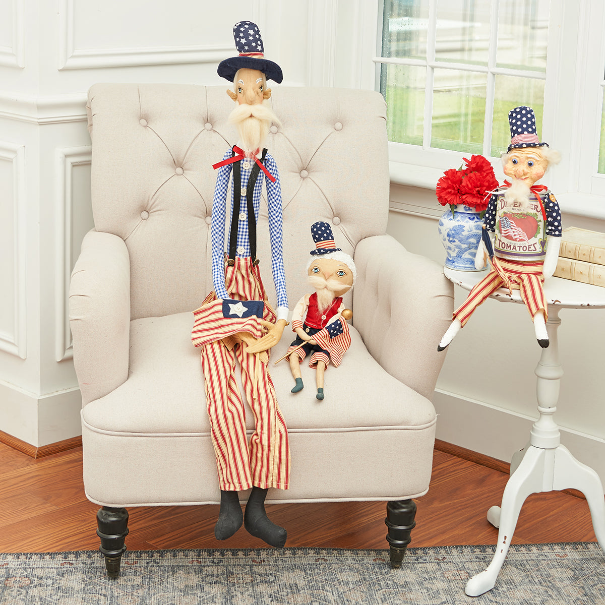 The iconic image of Uncle Sam is given new life in Gathered Traditions by Joe Spencer. Uncle Sam sports bold and bright Americana garb and a vintage American flag, ready to announce I want you to have the perfect addition to your patriotic collection and Independence Day decor. Display Freedom Sam with more art dolls from Gathered Traditions by Joe Spencer to bring a classic American charm to your home.