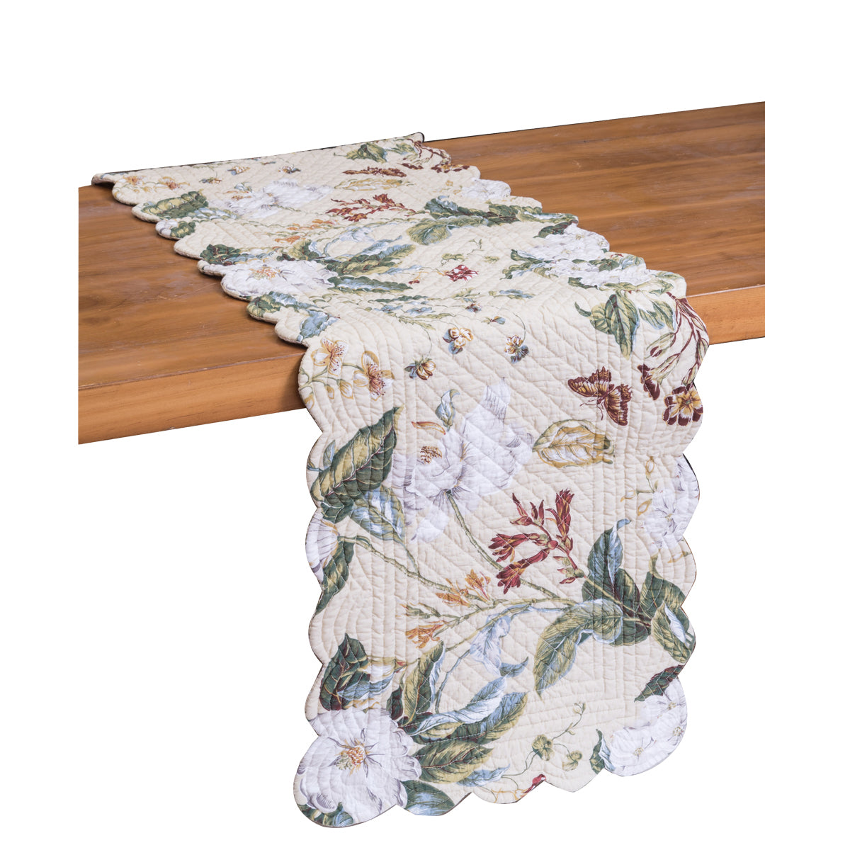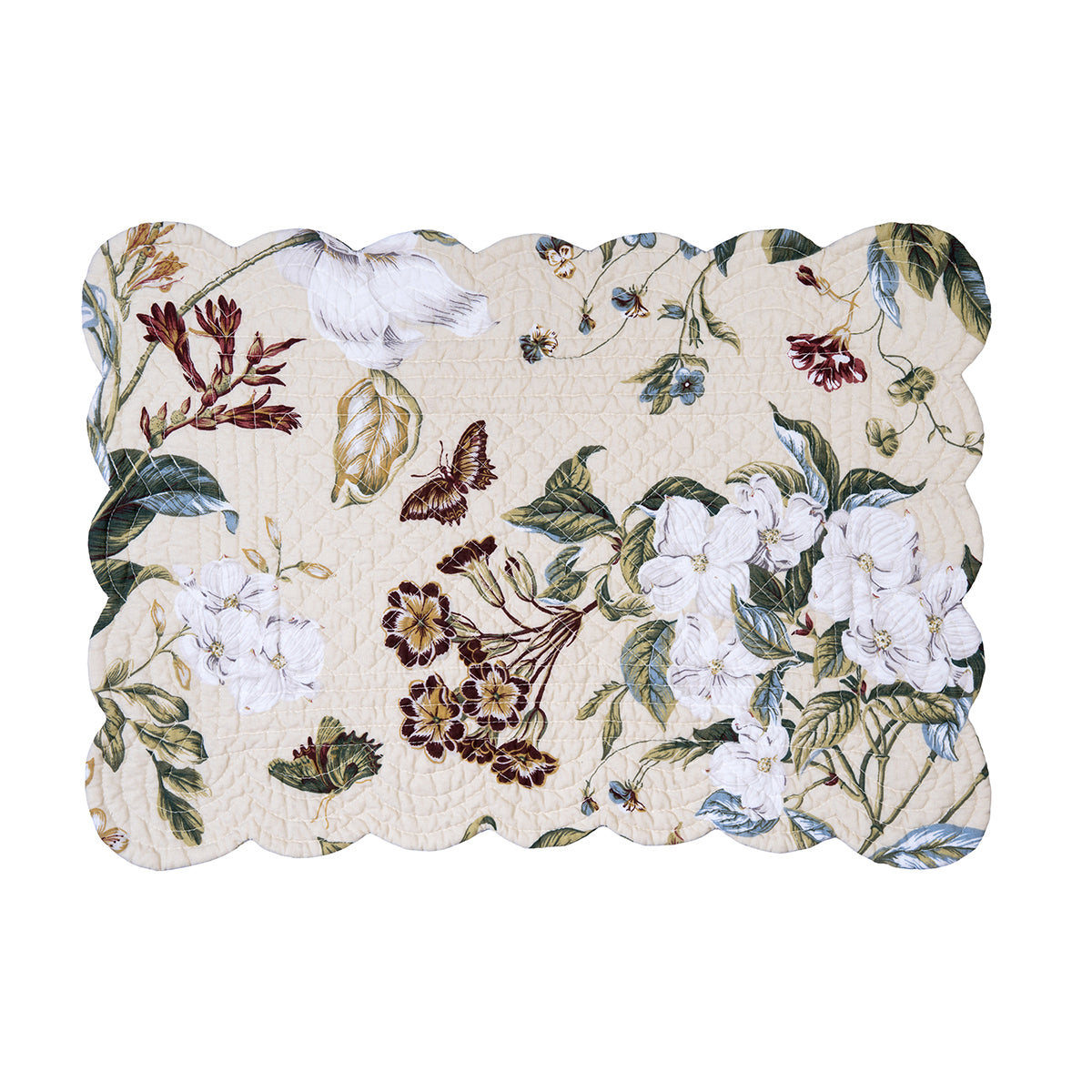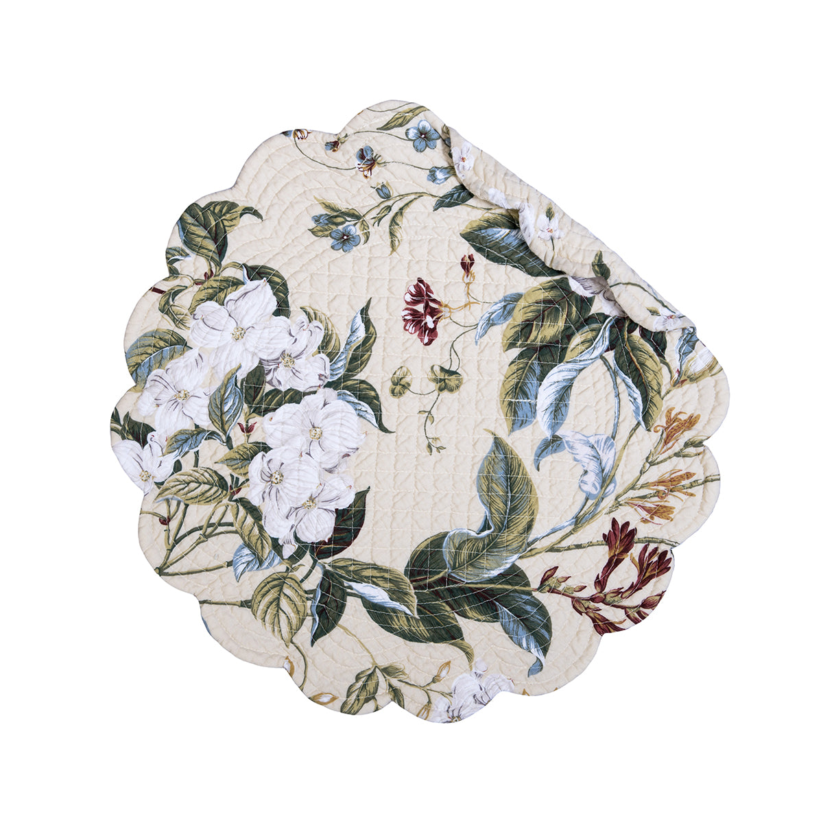 Created in collaboration with the Colonial Williamsburg Foundation, the Garden Images quilted table linen collection beautifully showcases the timeless elegance of the magnolia. Featuring crisp white magnolias framed by flowing leaves and delicate flower stems, this design captures the grace and artistry of nature. Set against a natural background, the palette of icy blue, earthy green, and brassy yellow adds warmth and depth, making these linens a versatile addition to any table setting. For added flexibility, the reverse side features a smaller magnolia and vine pattern, allowing for more negative space and creating a softer, more delicate look. The quilted texture enhances the intricate details, blending classic charm with everyday functionality for a refined, heritage-inspired look. Love this look? Garden Images is also available as a bedding collection.