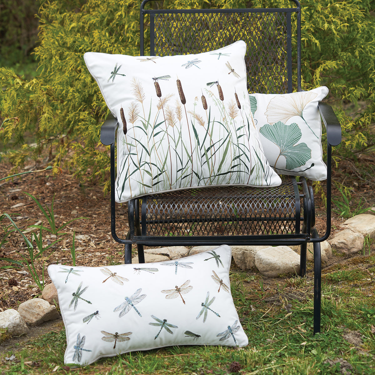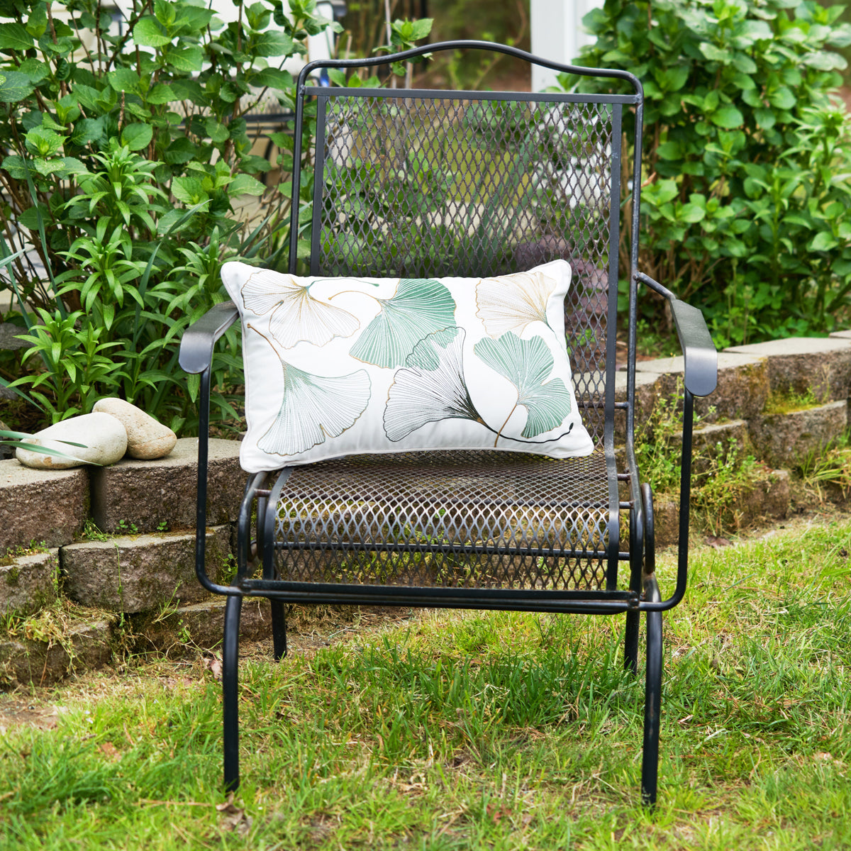 Elevate outdoor decor with this ginkgo covered lumbar pillow. Adorned with graceful ginkgo leaves in delicate shades of sea glass, this lumbar pillow adds a touch of botanical beauty to any living arrangement.