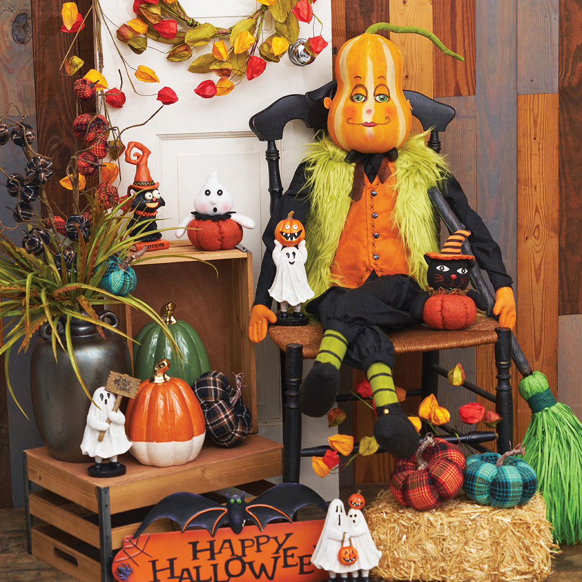 With a fluffy green coat, orange vest, and a soft smile  Gregorio has everything you need to create a festive autumn scene. Display Gregorio Gourd with more Gathered Traditions art dolls by Joe Spencer and watch your shelves magically transform.