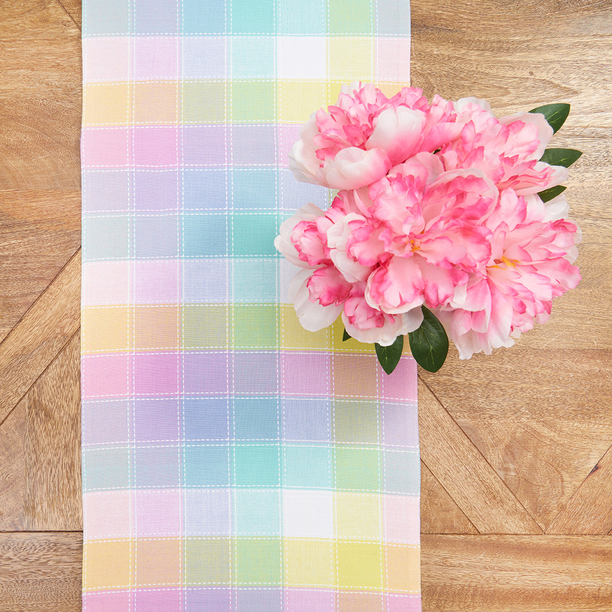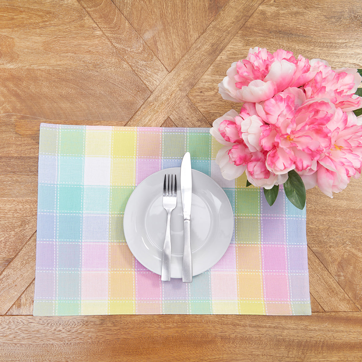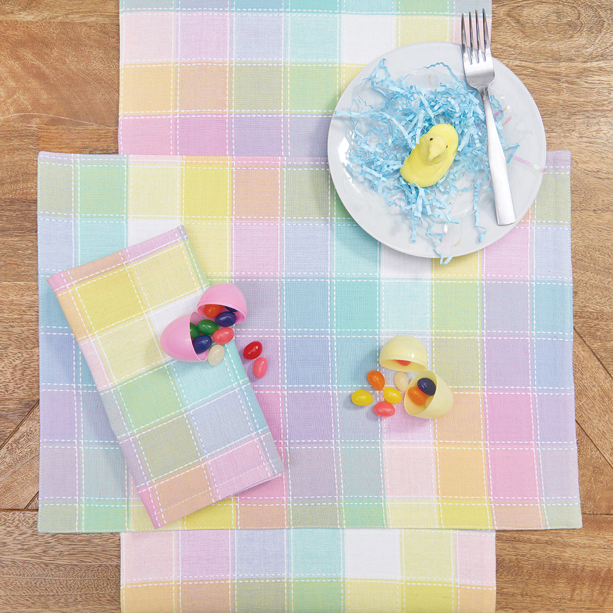 The Hana Color Block Plaid woven table linen collection is a stunning ensemble that boasts a plaid design intricately woven with a vibrant spectrum of pastel hues. This delightful array of colors evokes the image of a flourishing garden in springtime, reminiscent of an assortment of delicate blooms in full bloom.