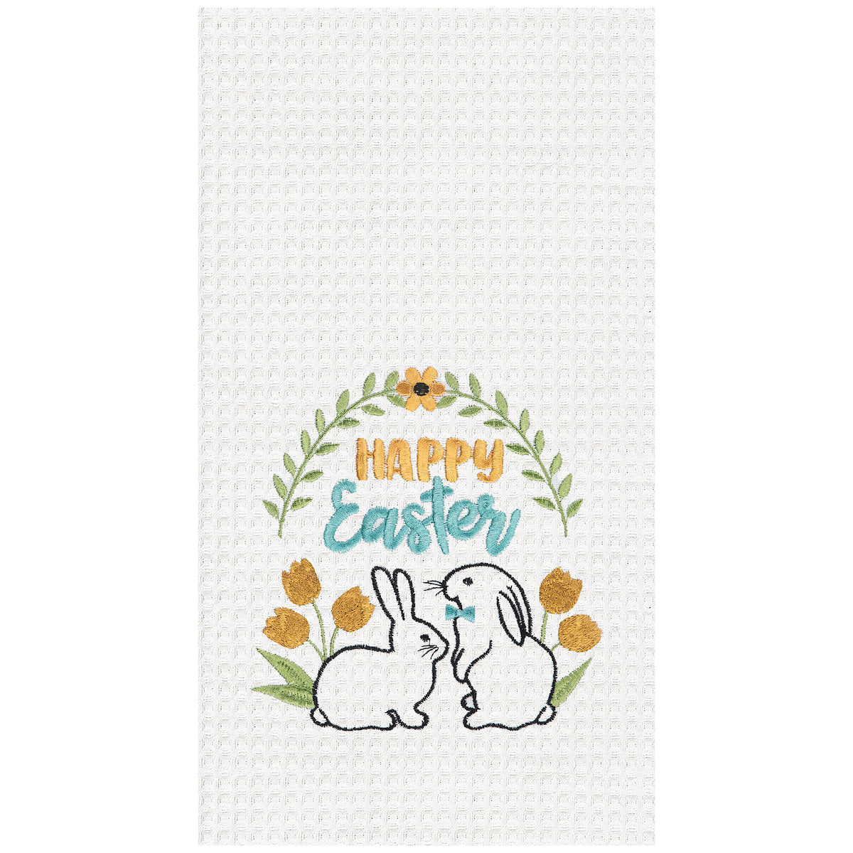 Celebrate Easter in style with this beautifully embroidered waffle weave towel, featuring the cheerful words "Happy Easter" above two sweet bunnies nestled beneath an arch of lush greenery. Surrounded by bright yellow tulips, this towel brings a fresh and festive touch to your home. The soft waffle weave texture ensures it’s not only a charming decor piece but also a functional addition to your kitchen or bathroom. Perfect for welcoming the season of renewal, this towel is a lovely way to spread Easter joy and add a vibrant, nature-inspired element to your space.