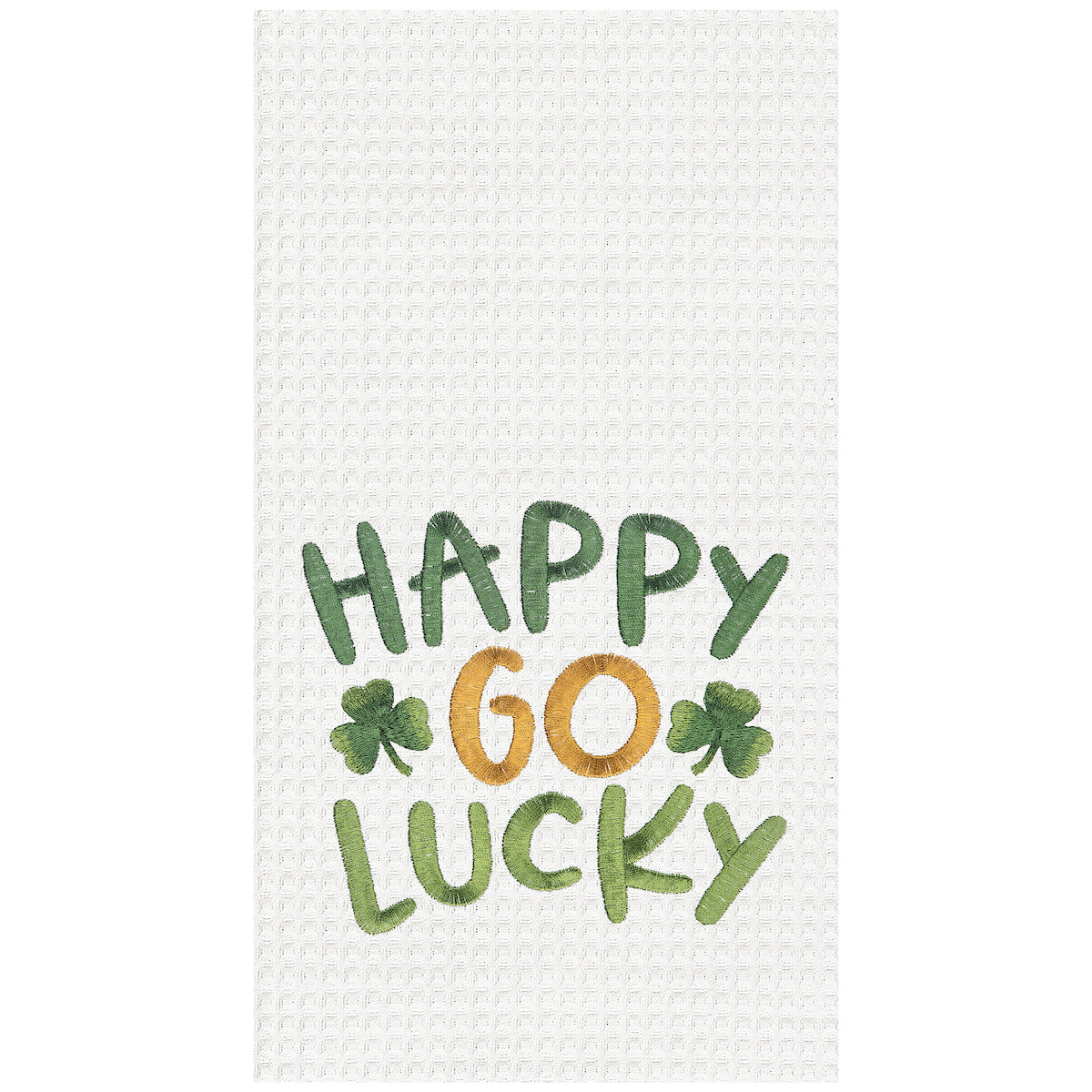 Add a dash of charm and cheer to any kitchen with this whimsical waffle weave towel! Embroidered with the uplifting phrase "Happy Go Lucky" and surrounded by two lucky clovers, this towel brings a playful and optimistic vibe to any space. Perfect for everyday use or as a thoughtful gift.