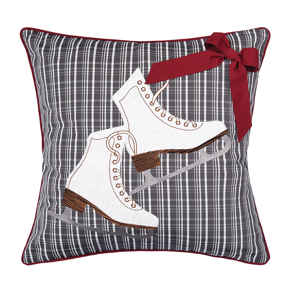 Embrace the festive spirit of wintertime with this Holiday Skates Indoor Outdoor Pillow. Featuring a stylish black and grey plaid background, this pillow is elegantly trimmed in vibrant red. At its center, a charming pair of white skates adorned with intricate embroidery adds a whimsical touch to any decor. Perfect for both indoor and outdoor settings, this pillow combines seasonal cheer with durability, making it a delightful accent for holiday gatherings and winter festivities.