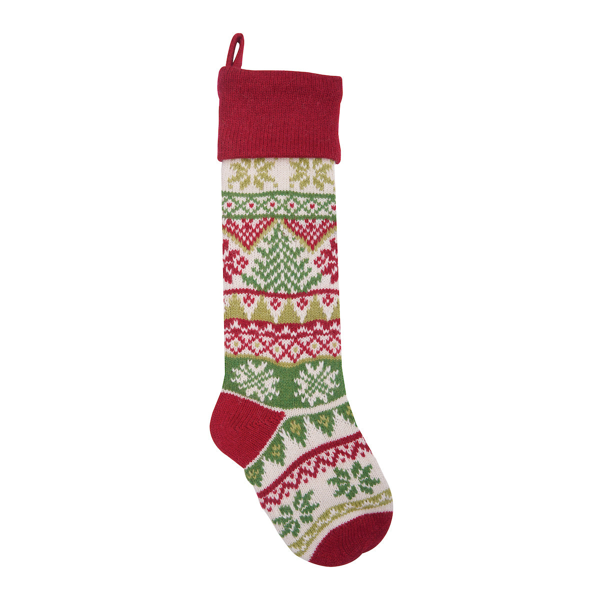 Relax with a cup of hot cocoa next to the fireplace as this cozy winter jacquard stocking hangs from the mantle. Featuring a traditional red, green, and white pattern, this stocking is large enough to hold all of the items on your Christmas wish list. Mix and match with our knit stocking collection for a complete holiday display.