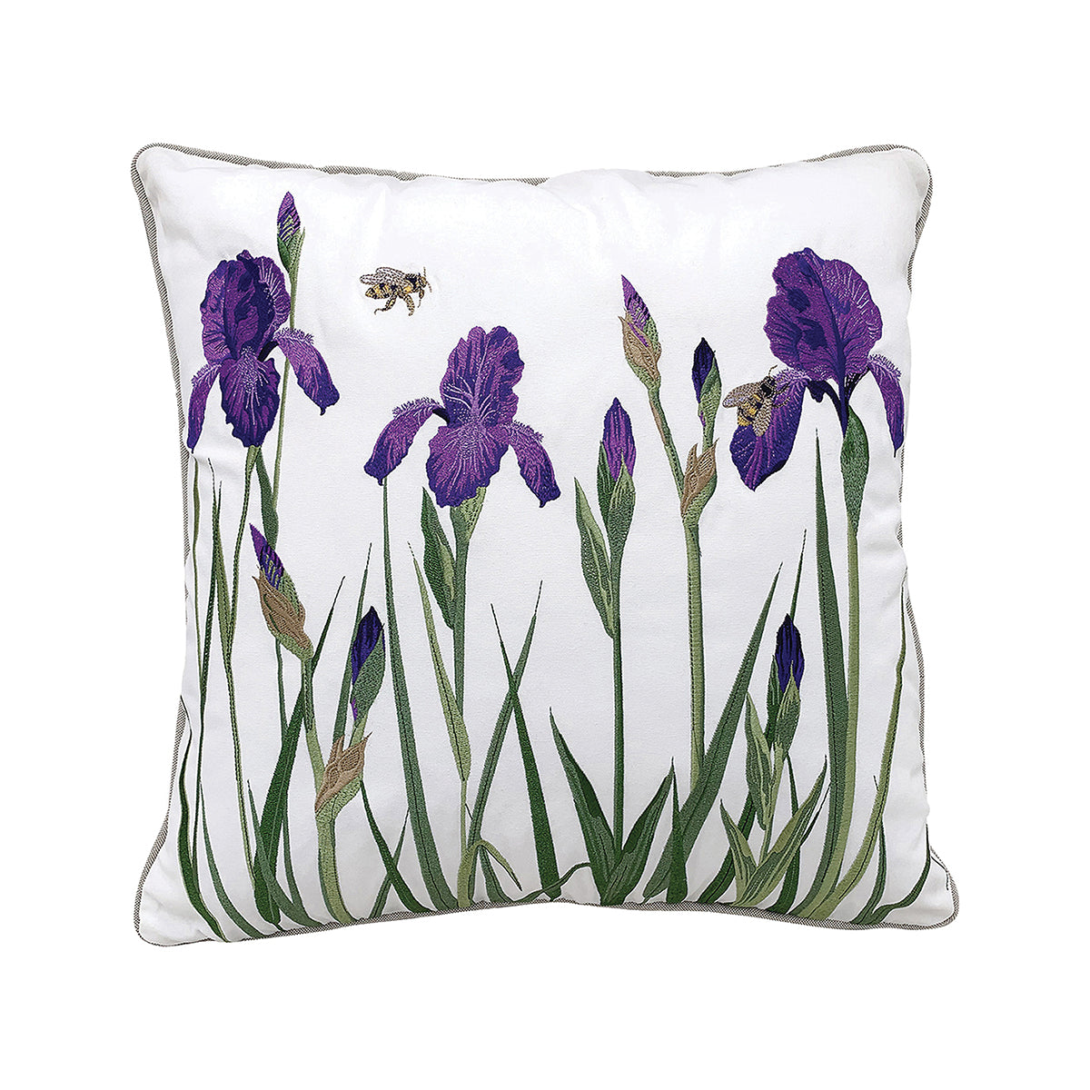 Heavily embroidered purple iris and visiting honey bees atop sun-fade-resistant panels this pillow is made outdoor tough.