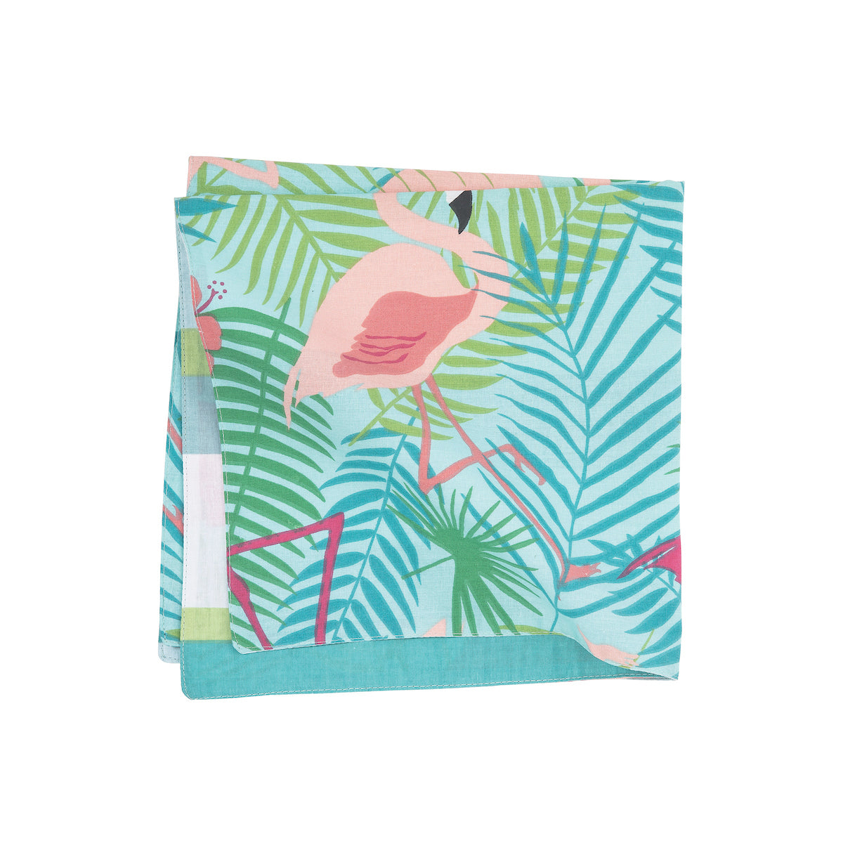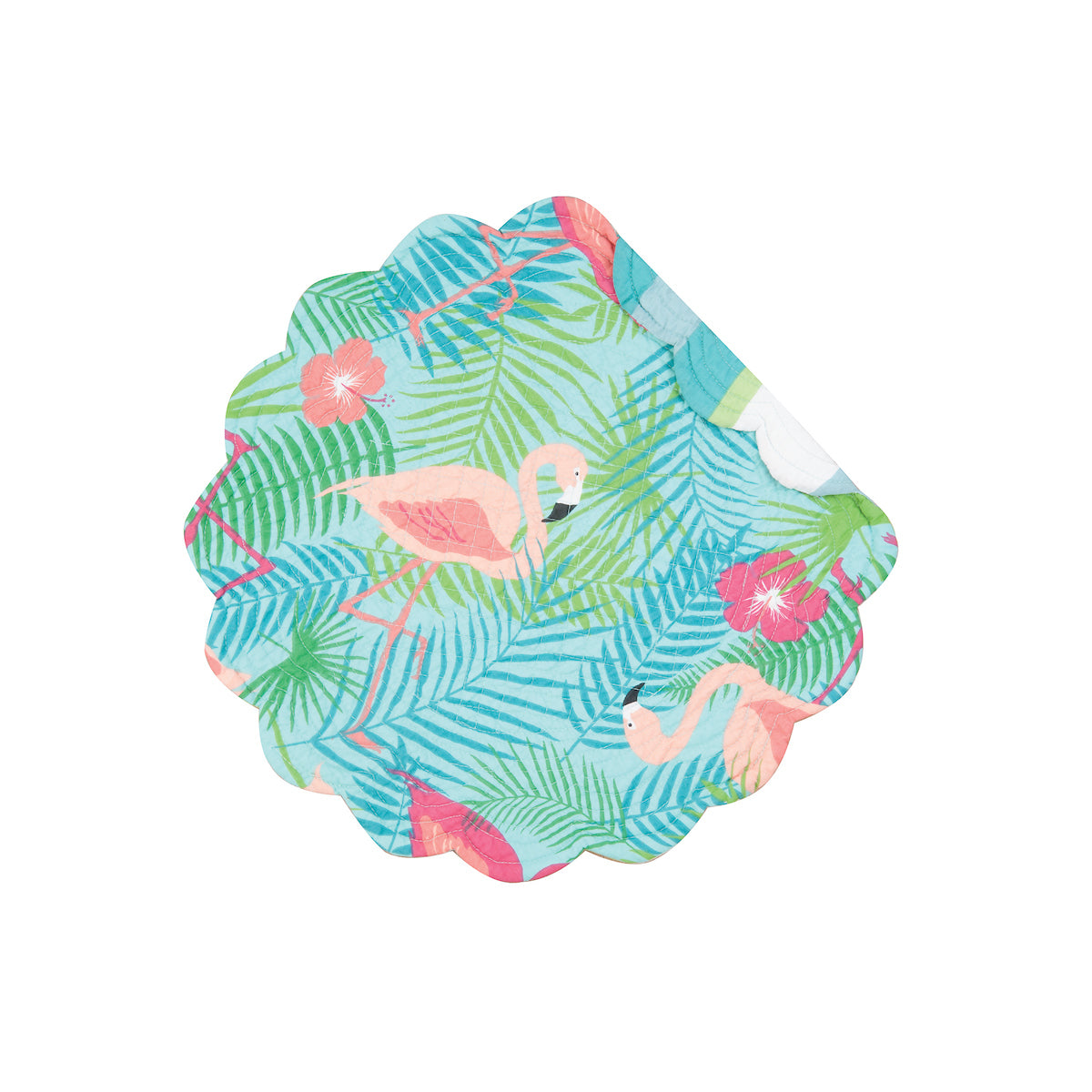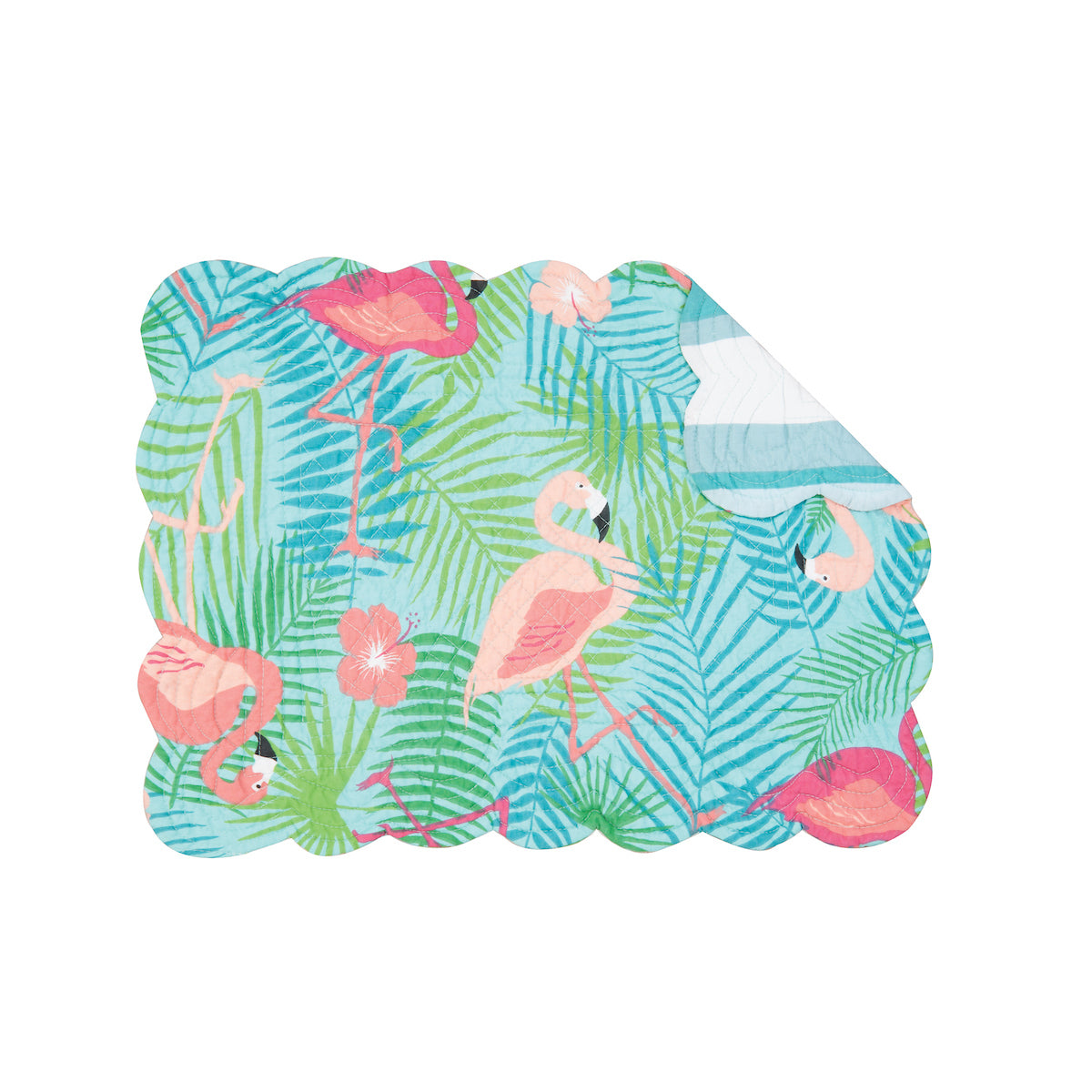 Tropical, fun, and a little sassy, the Isla Tropics tabletop collection is the perfect addition to your cottage by the sea. In a vibrant colorway comprised of aqua, lime, and pink, this tabletop reversible napkin features an allover palm leaf and flamingo print, sure to brighten up any room. Reverse to a blue and lime striped pattern for a more subtle look. Crafted of cotton, and machine washable for easy care. Available in rectangle placemats, round placemats, table runner and reversible napkins available separately.