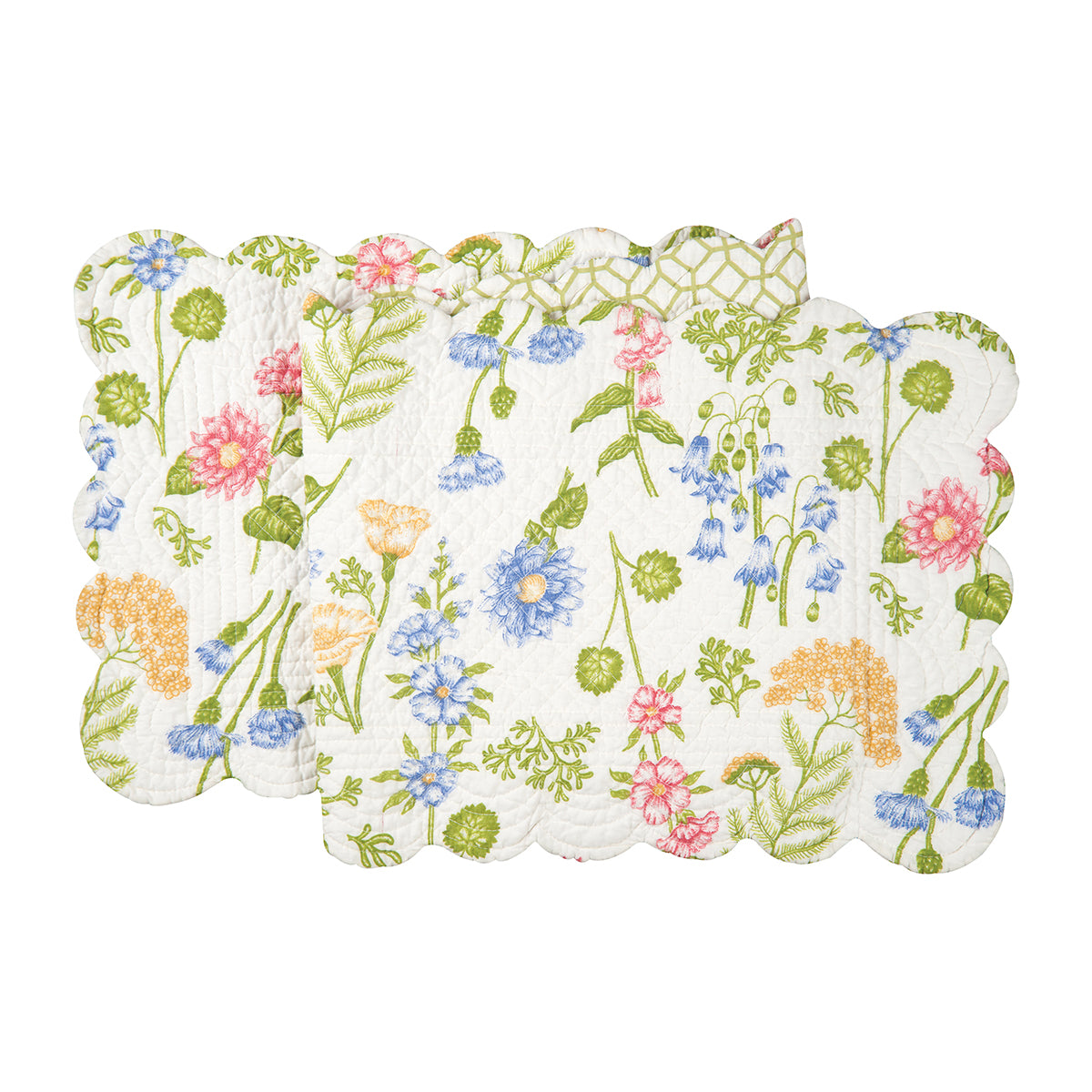 Find solace in a field of wildflowers with the Jeanette tabletop collection. A delicate floral pattern brings a soft touch to a white ground with a color way comprised of blue, pink, yellow and green. Reverses to a coordinating summer plaid pattern for additional styling options. Crafted of cotton and machine washable for easy care. Love this pattern? Jeanette is also available in our bedding collection and window treatments.
