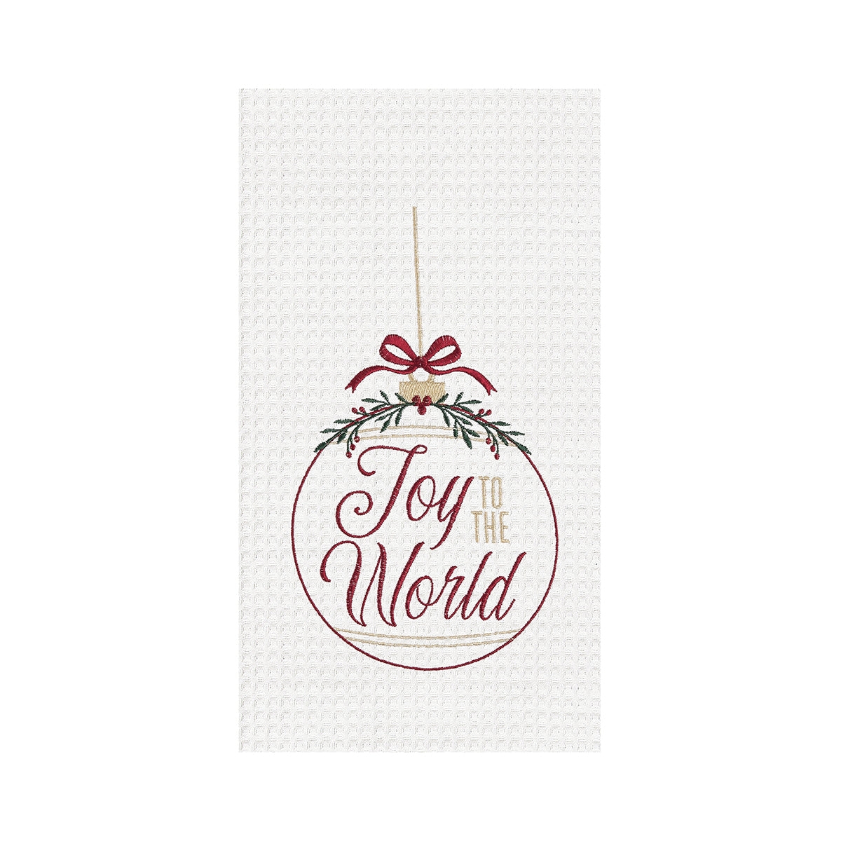 Crafted from cotton, this Joy To The World Ornament Embroidered Waffle Weave Towel features a dangling ornament, complete with a delicate script holiday saying and topped with holly berries and a merry red bow.